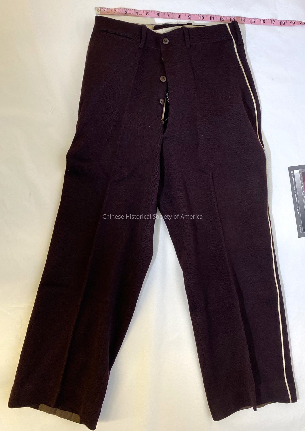 Burgundy colored pants with a cream colored stripe on the outside of each pant leg. The fly is fastened with five burgundy colored buttons, made of some sort of plastic (presumably Bakelite or celluloid). On the interior of each pant cuff is a band of fabric, that was used to keep the cuff resting on the top of the heel of the wearer's shoes. The pants have two hip pockets and one back pocket on the right side. Inside, sewn to the back pocket, is a label which reads, "Mr. Sam Wong Date 2/22/37 No. 5456-35". These pants were part of the Cathay Band uniform.Context
