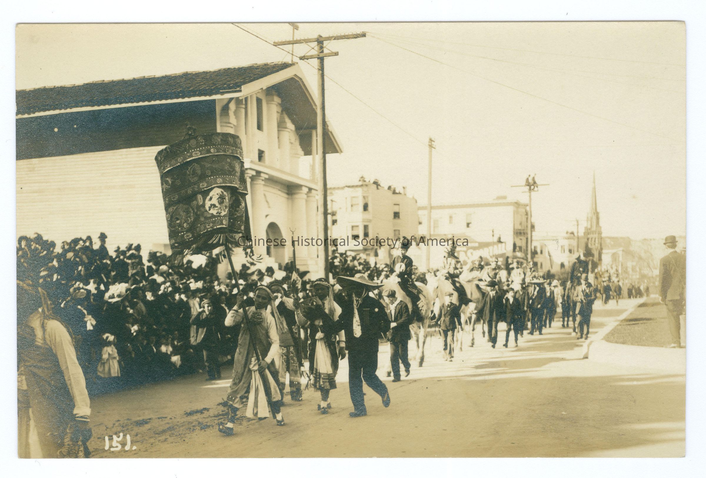 B&W. Photo. SF; Parades: A procession of people on the street with the man at the front holding a pole with a silk clothe umbrella at the top followed by officials on horses with people lined up on the sidewalk.