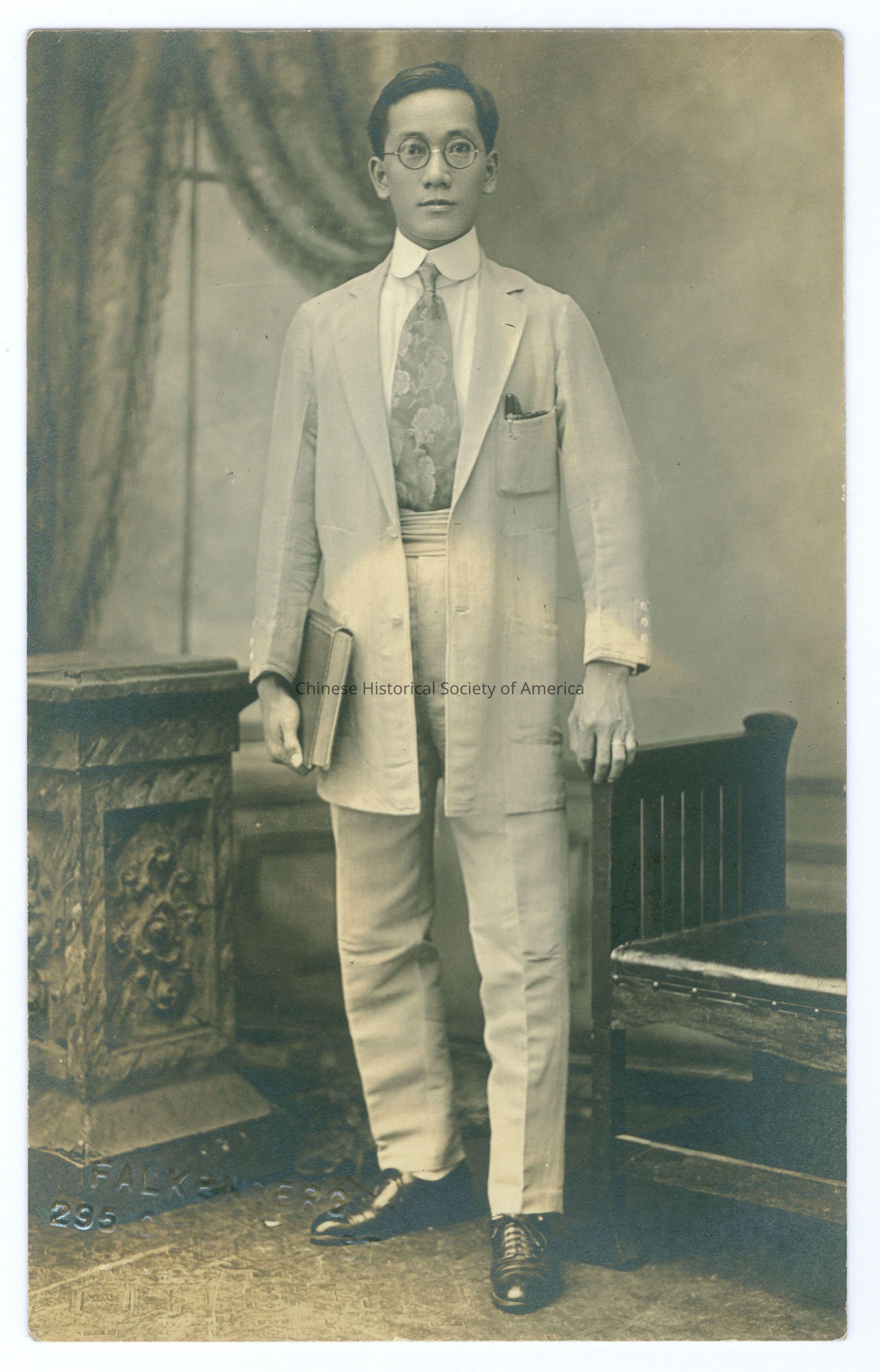 B&W. Photo. New York; Men: Picture of a Chinese man wearing glasses and suit and tie, he is standing with a book under his arm and next to a leather chair.