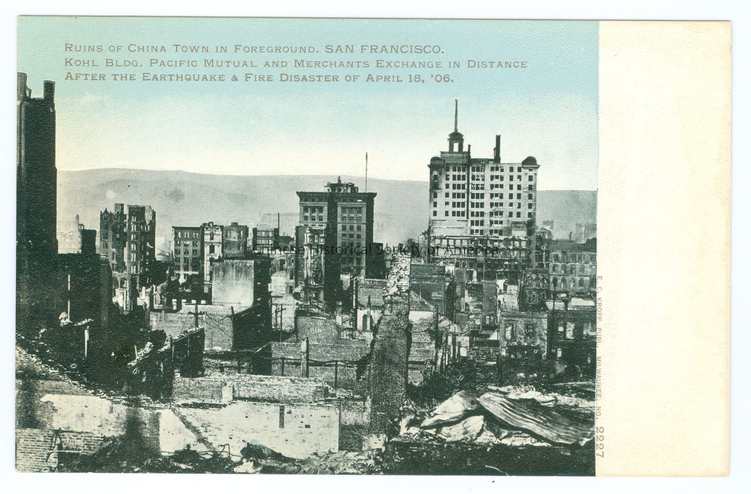 Front: Caption: "Ruins of China Town in Foreground. San Francisco. Kohl Bldg. Pacific Mutual and Merchants Exchange In Distance After the Earthquake & Fire Disaster Of April 18, '06." "E.C. Kropp, Publ. Milwaukee, No. 2227." Back: "3-", handwritten in pencil