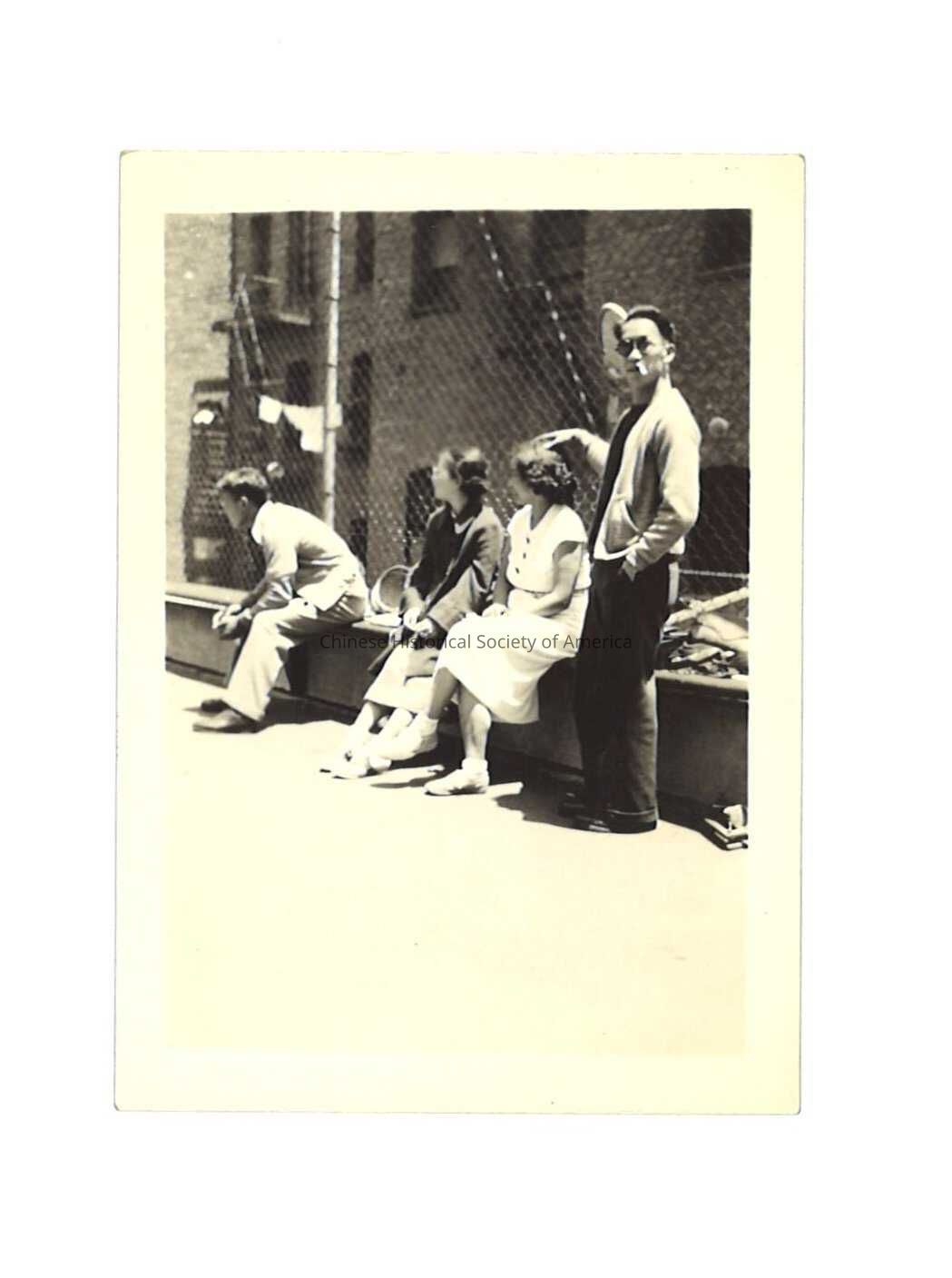 2 women and 2 men sitting and standing in front of a chain link fence watching a sports game. One man faces the camera.