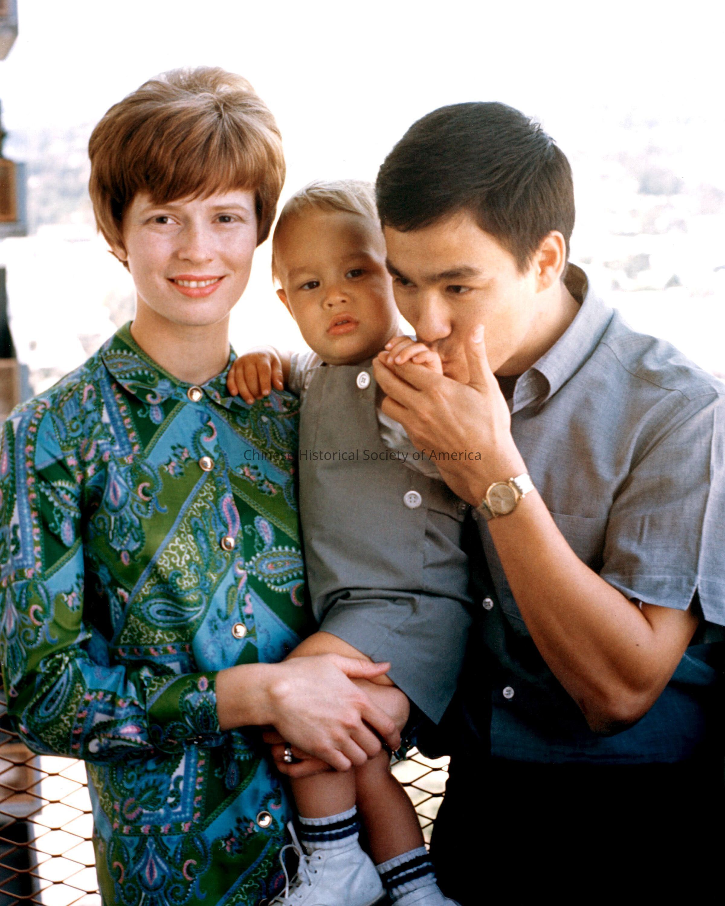 Retrieved from Bruce Lee Foundation: Bruce in blue shirt, kissing hand of Brandon, toddler, baby, who is held also by Linda. Family portrait.