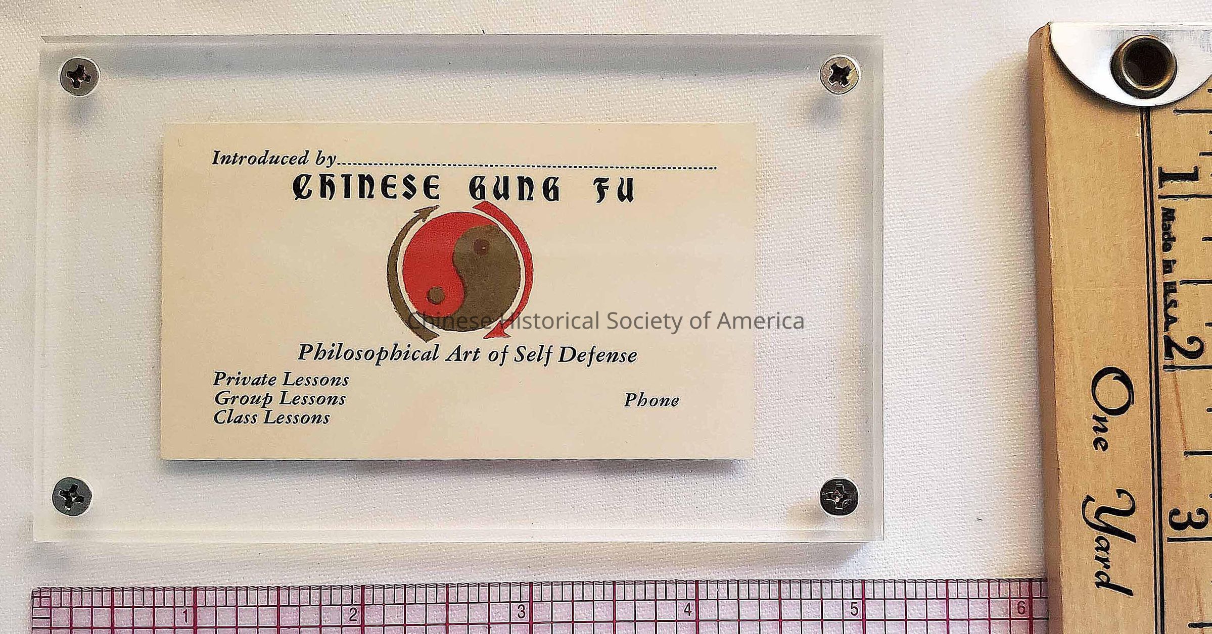 Business card for Bruce Lee, "Chinese Gung Fu", encased in plexi.Dimensions