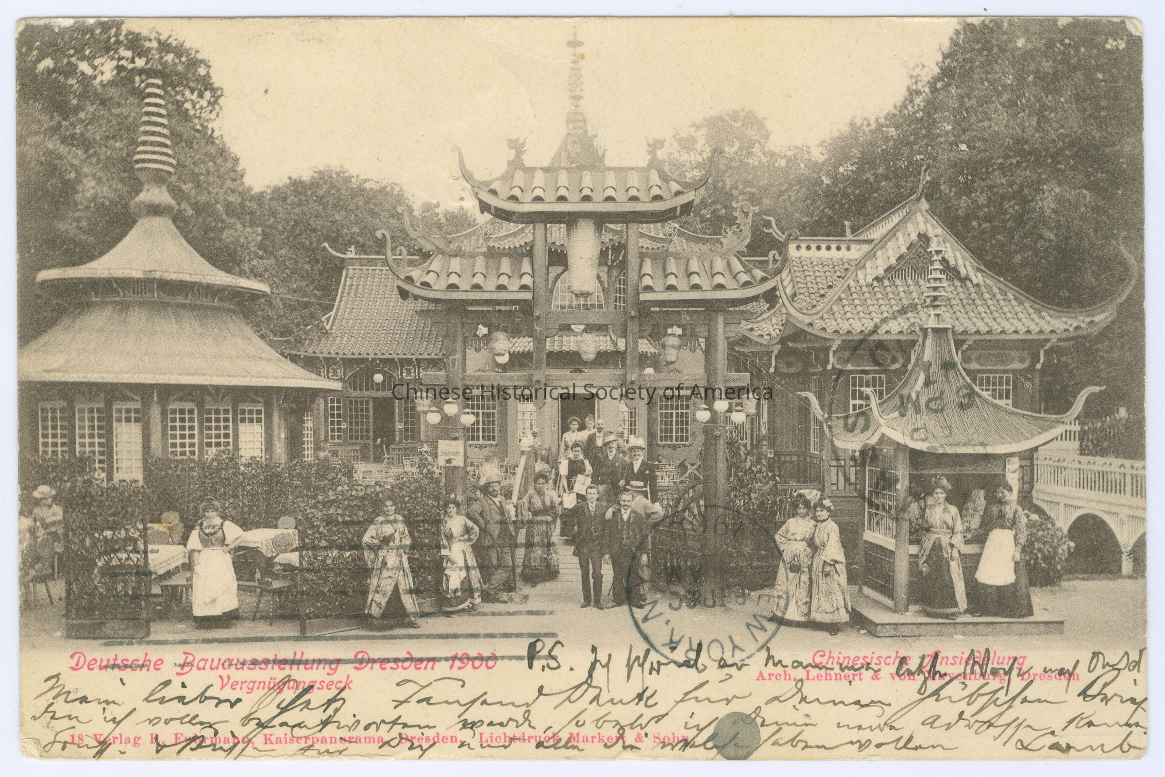 Front: Caption: "Deutsche Bauausstellung Dresden 1900 Vergnugugseck, Chinesische Finsicdelung Arch. Lehnert & von Vavenburg Dresden." Message: Illegible. "18 Variag R. Fuhrmann, Kaiserpanorama, Dresden. Lichtdruck Markey & Sons." Back: Postmark: 3 postmarks, one of them is illegible, "Mass. Sep 25 1900, 1 AM"; "Mass. Sep 25 1900, 5 PM" stamped in black. Stamp: a ten cents red stamo with a side picture of __, "10, 10 Reichspost". Message: "Miss Emily It. Capeland, _______________" handwritten in black. Old Accession #: D)-