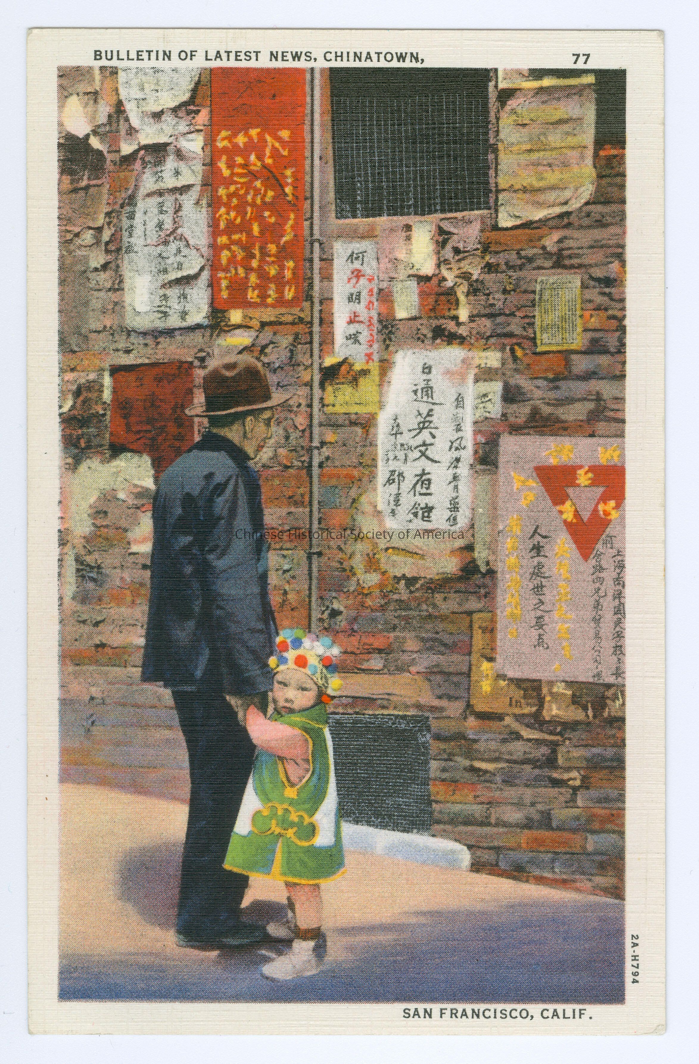 Front: Caption: "Bulletin of Latest News, Chinatown, San Francisco, Calif. 77." "2A-H794." Back: Info. Text: "The Latest News Chinatown's Bulletin Boards are always a source of interest to San Francisco visitors. The latest news is posted on the walls of buildings, and the Chinese gather about to learn of world events."