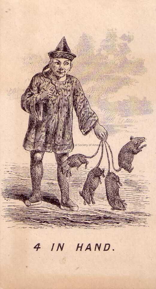 Front: A man in a cone shape hat, and traditional Chinese robe is scolding at the four rats that he has clutched by their tails in his hand. He is standing in a field with a sky background behind him. On the bottom of the card is the caption 4 in Hand.