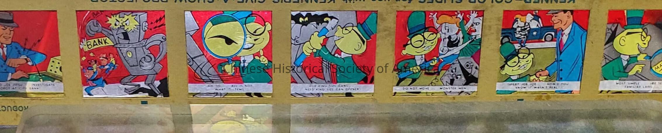 Color slide with Dick Tracy, an Asian male, and other cartoon characters illustrated in a racist storyline.Context