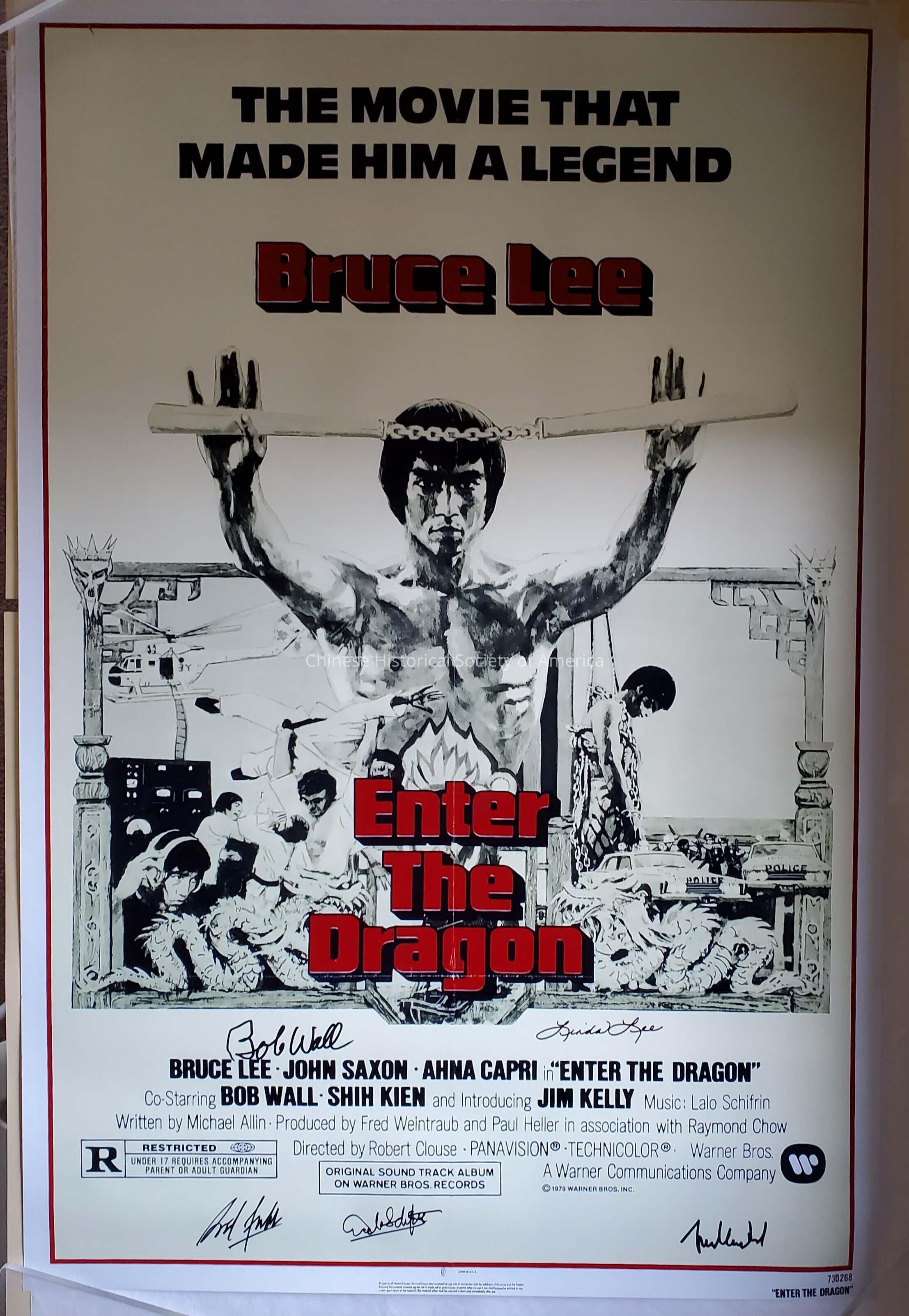 Bruce Lee with nunchucks as the main character, also shows Jim Kelly and Bob Wall in English, signed by 5 people, Bob Wall, Linda Lee and 3 others, by Warner Bros., 1979.Context