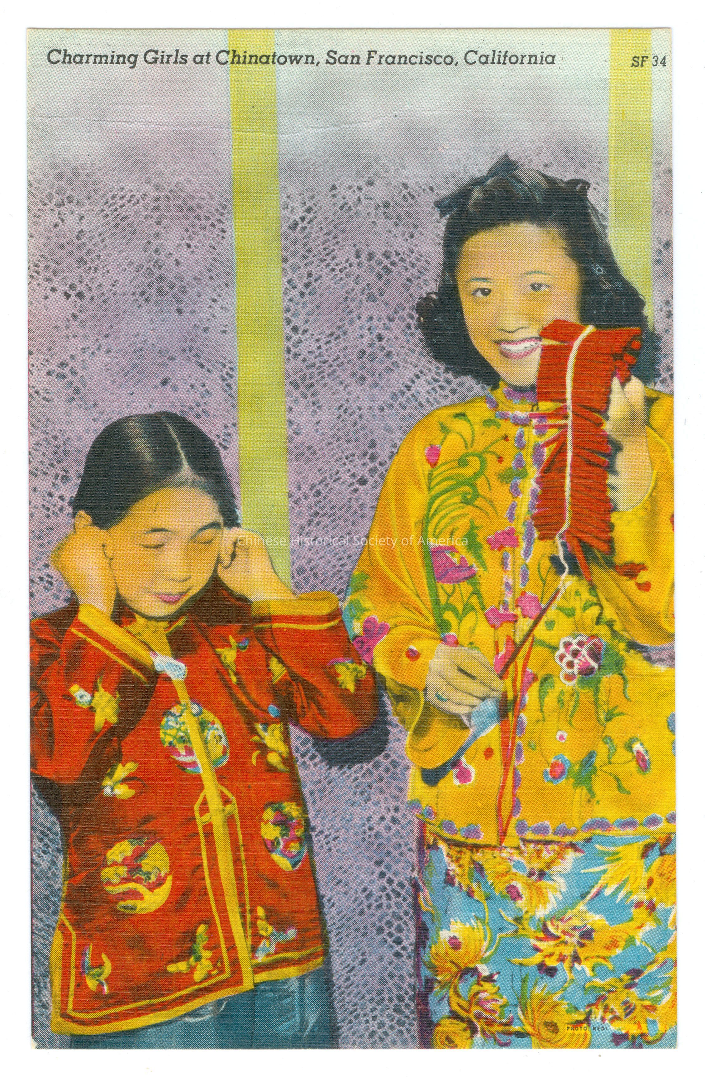 Duplicate: CHSA-04483. Front: Caption: "Charming Girls at Chinatown, San Francisco, California SF 34." Back: Info. Text: "Charming Girls of Chinatown; San Francisco's Chinatown is the largest Chinese settlement outside of the Orient. Here over 20,000 Chinese live and have their own community life, subject of course to the laws of the land. The beauty and charm of this bit of the Orient is exemplified by the rare comeliness of these lovely Chinese girls." Old Accession #: D)-Dimensions