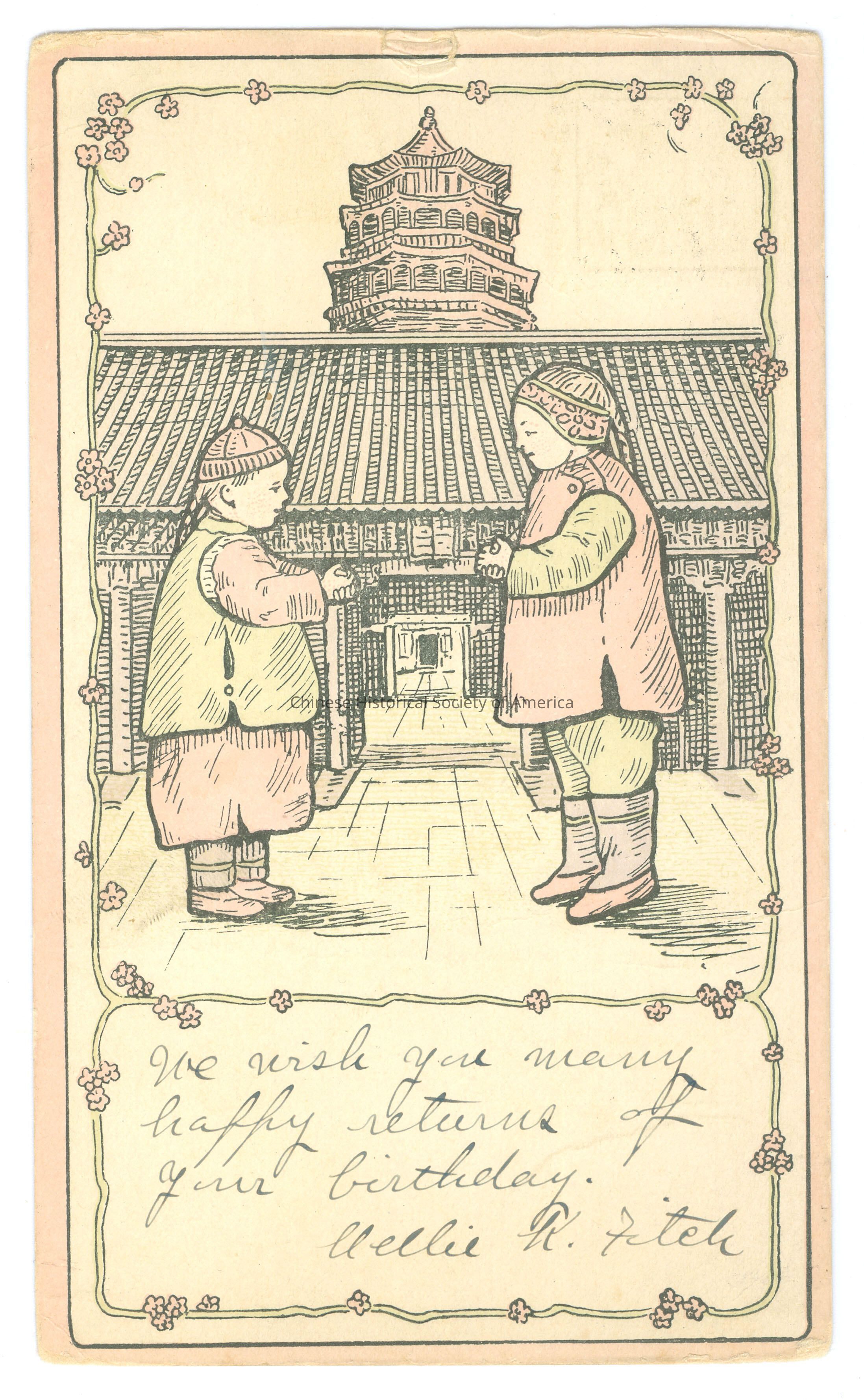 Color. Illus. Caricatures; Birthday Cards; Couples: A small Chinese man in traditional clothing with a queue has his hands clasped facing a tall Chinese woman wearing traditional clothing also with her hands clasped, background is pagoda.