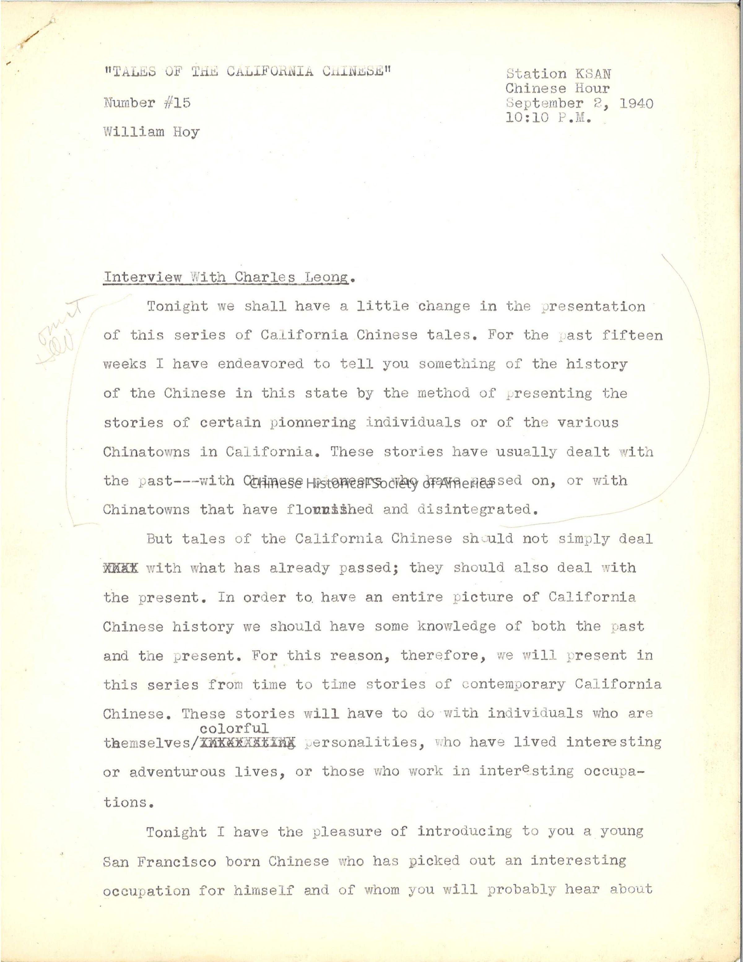 A manuscript copy of William Hoy's "Tales of the California Chinese" Number 15 from Chinese Hour on Station KSAN of September 2, 1940.