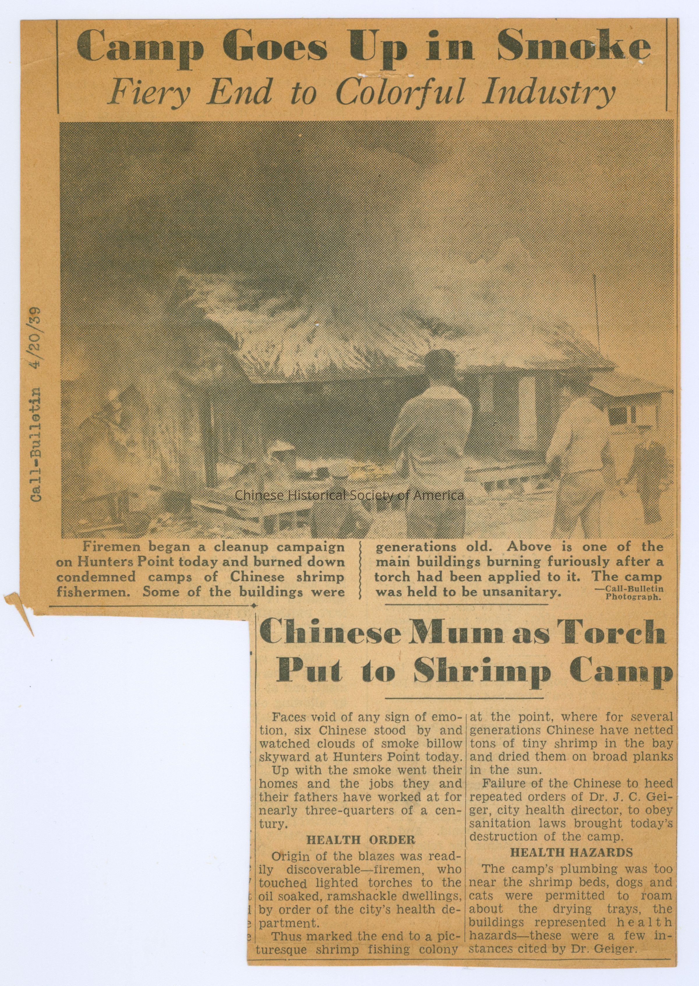 The San Francisco News newspaper article "Camp Goes Up in Smoke: Fiery End to Colorful Industry" on the aftermath of the destruction of a Chinese shrimping camp from 1939.