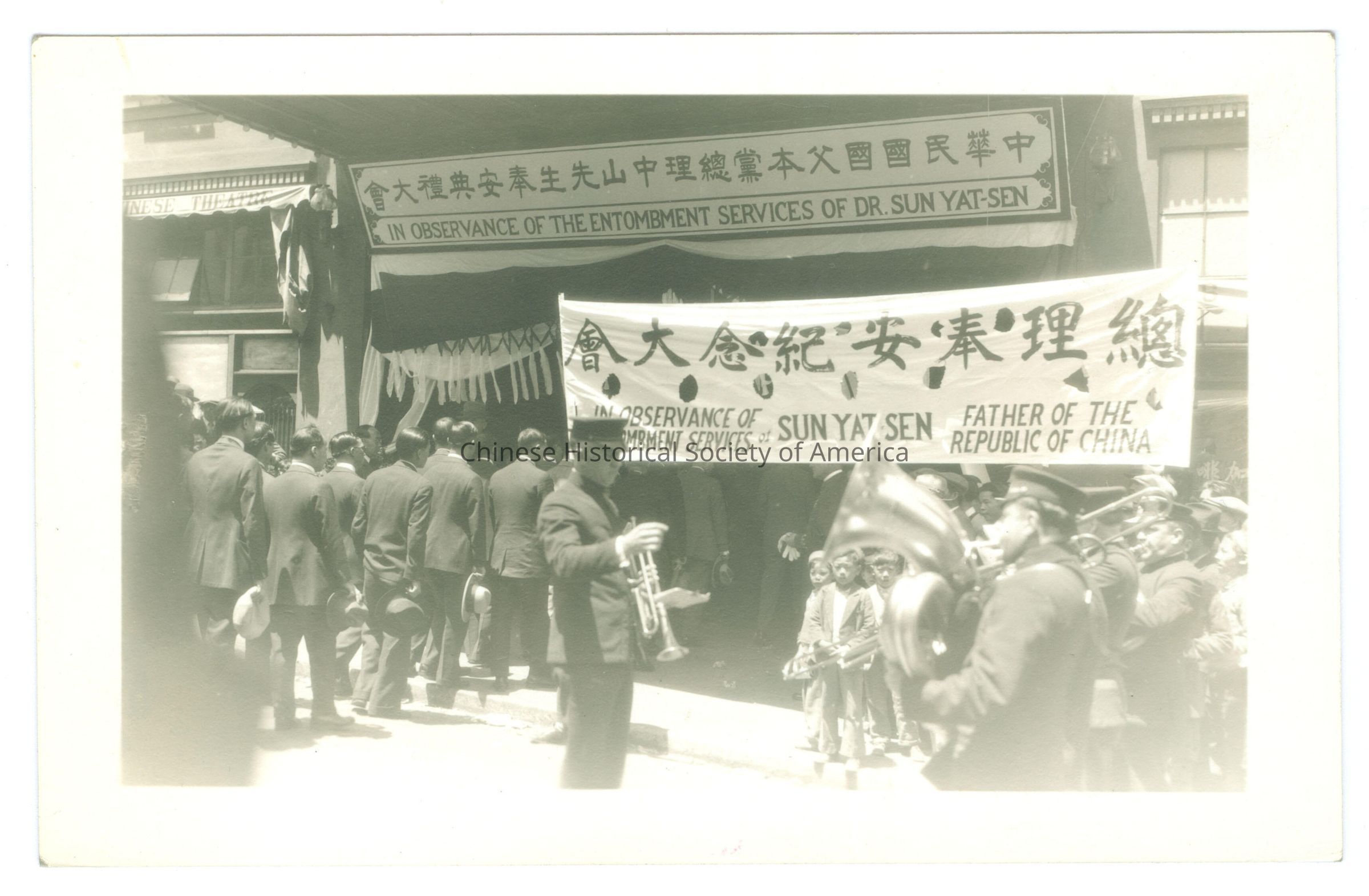 See CHSA-04465-04473. Front: The banner on the picture says "In Observance of Entombment Services; Sun Yat Sen Father of the Republic of China." Back: Old Accession #: N/A