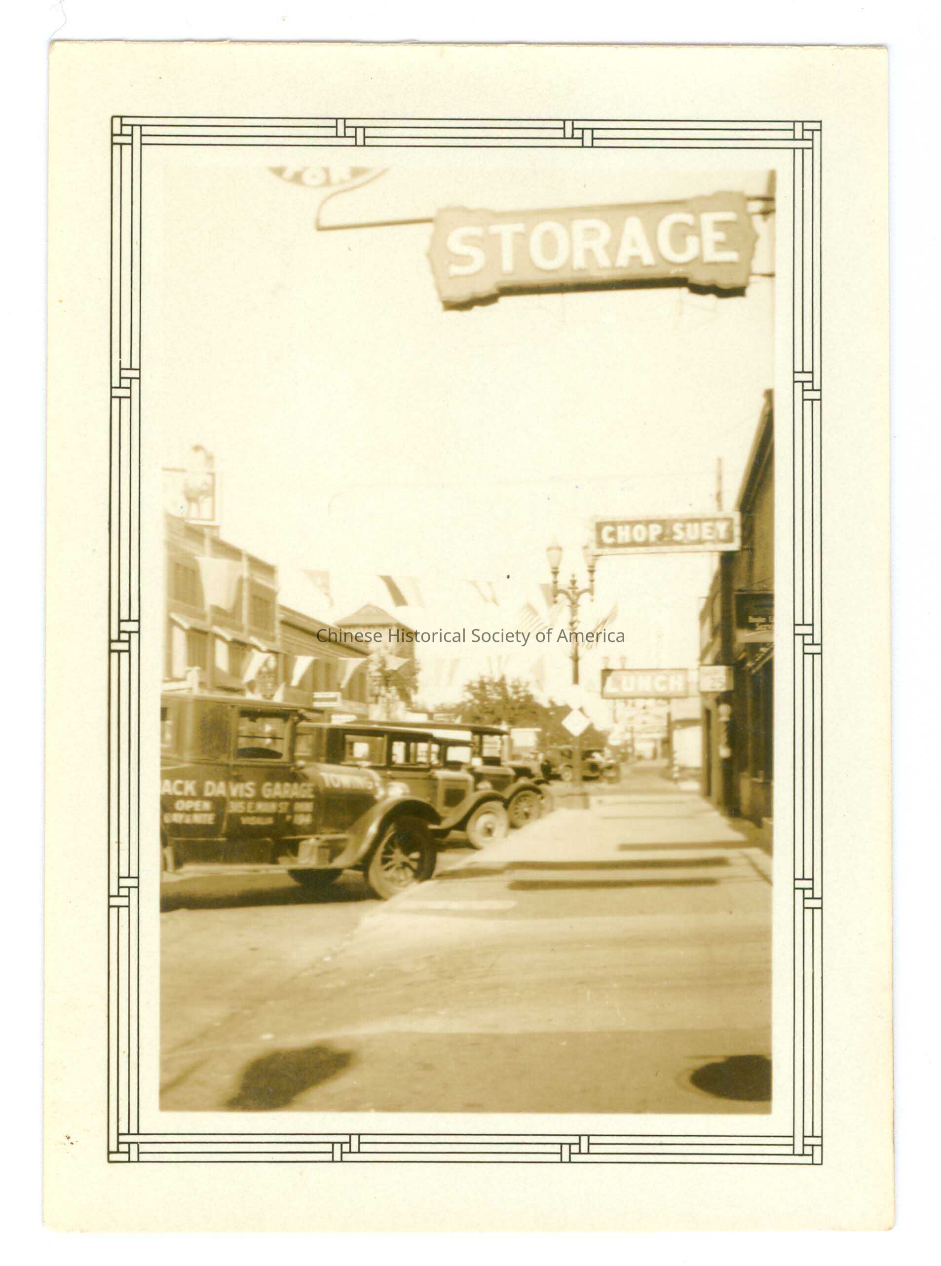 Photograph of cars parked in front of street with signs on the buildings advertising storage, chop suey and lunch.