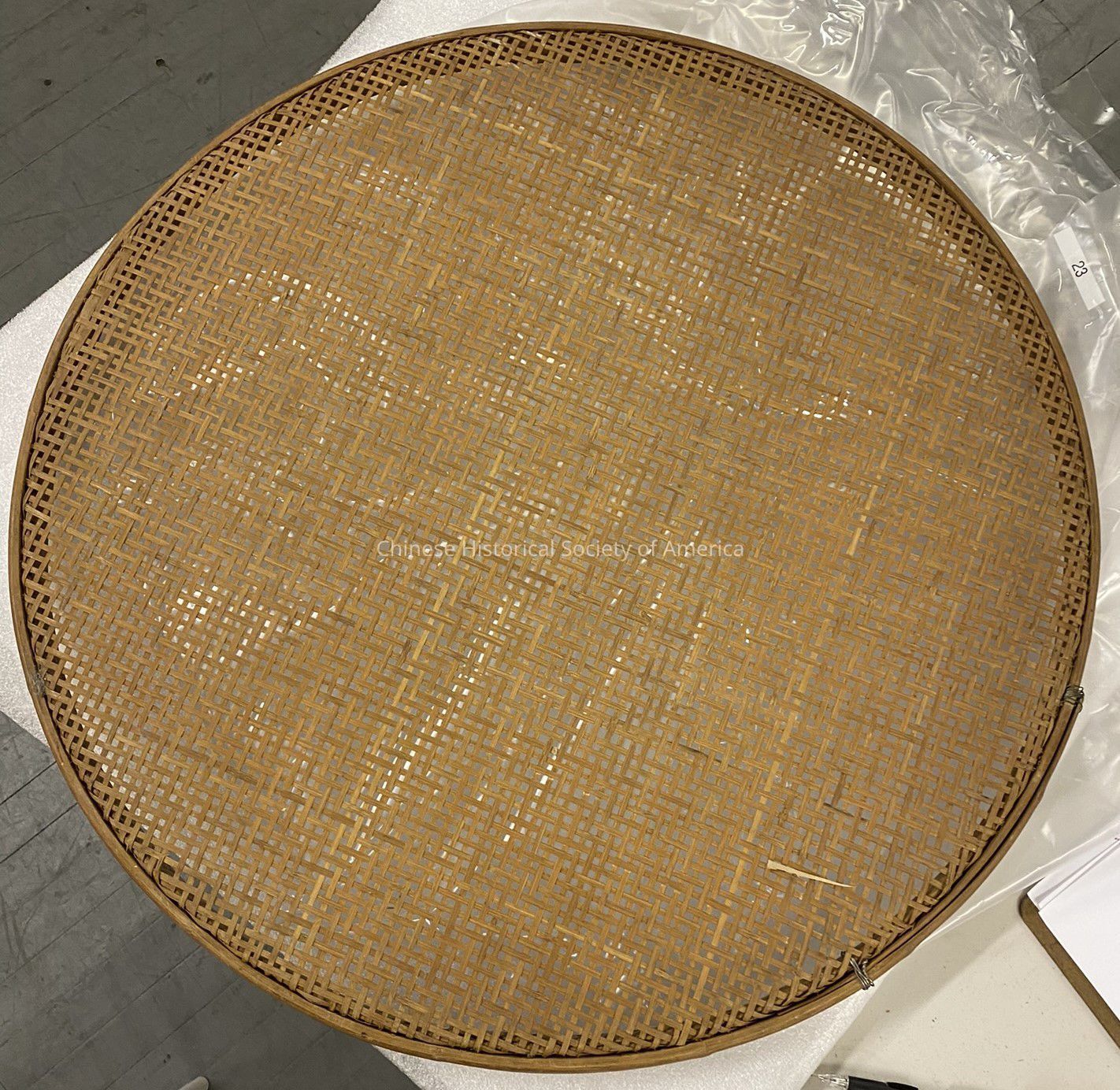 Shallow bamboo strainer typically used by Chinese American shrimp fishing industry.