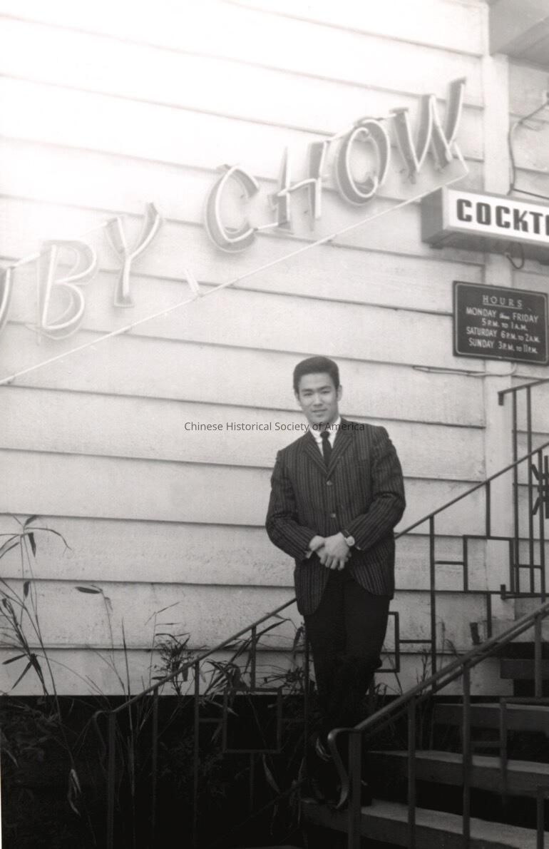 Retrieved from Bruce Lee Foundation: Bruce in Seattle, early years. Wearing a black suit standing on the steps of the Ruby Chow restaurant sign, cocktail sign. December 1960 notation.