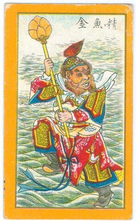 Color. Illus. China; San Shing Tobacco Co.: Orange border with the body of a person wearing traditional Chinese clothing with the head that is large, round and orange, it is holding a long pole with a round lotus globe at the end.