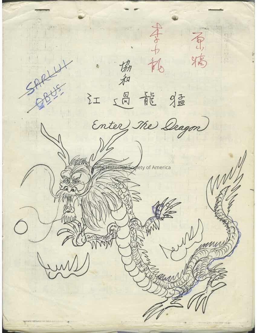 Enter the Dragon script with drawing of a dragon, Bruce Lee, illustrator, original 8.5" x 11", enlarged reproduction, original drawing - 1972.Context