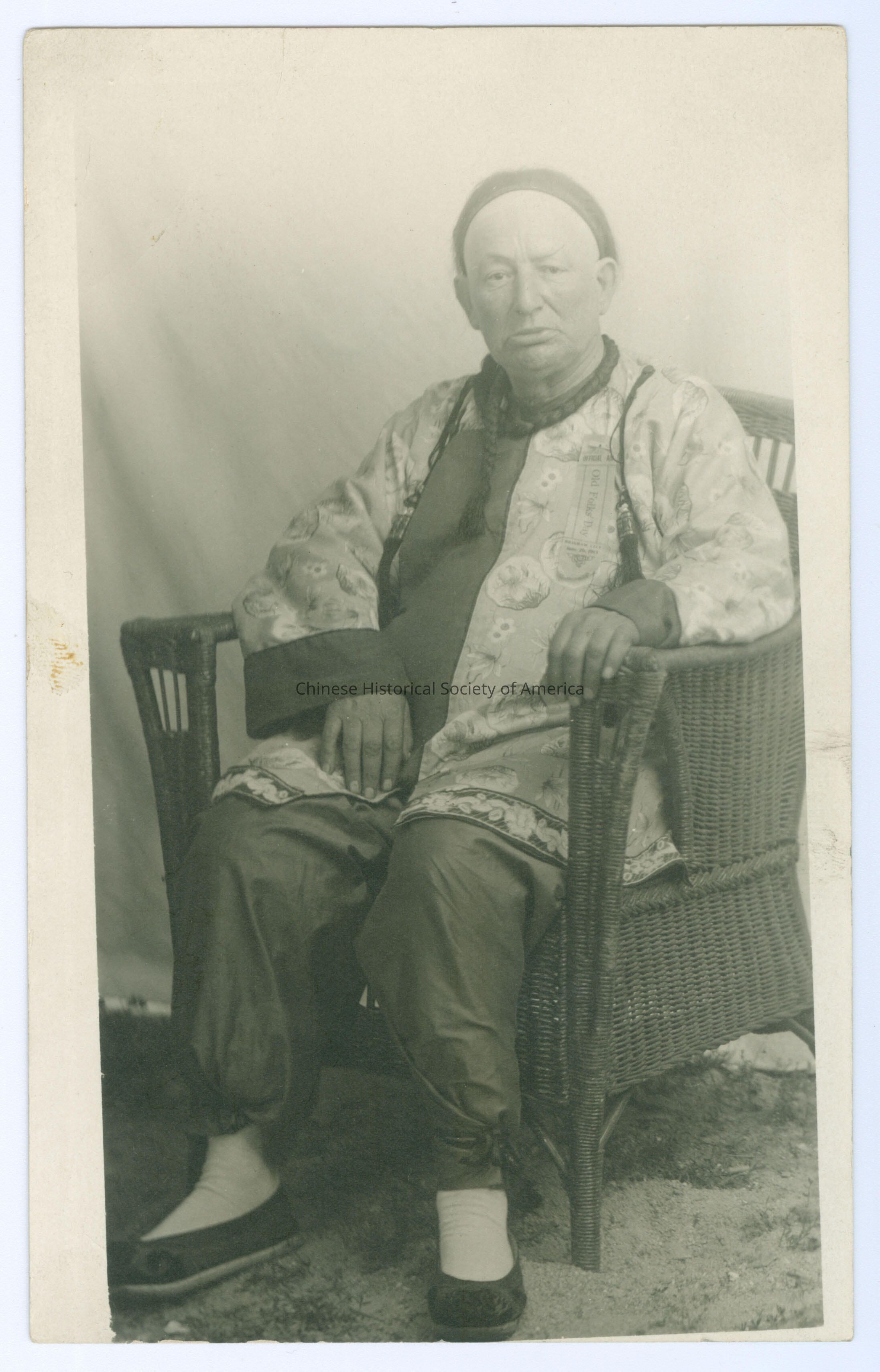 B&W. Photo. Men; Yellow Face: A White man has a queue and traditional Chinese clothing, he is sitting in a chair and there is a ribbon pinned on him that says "Old Folks' Day."