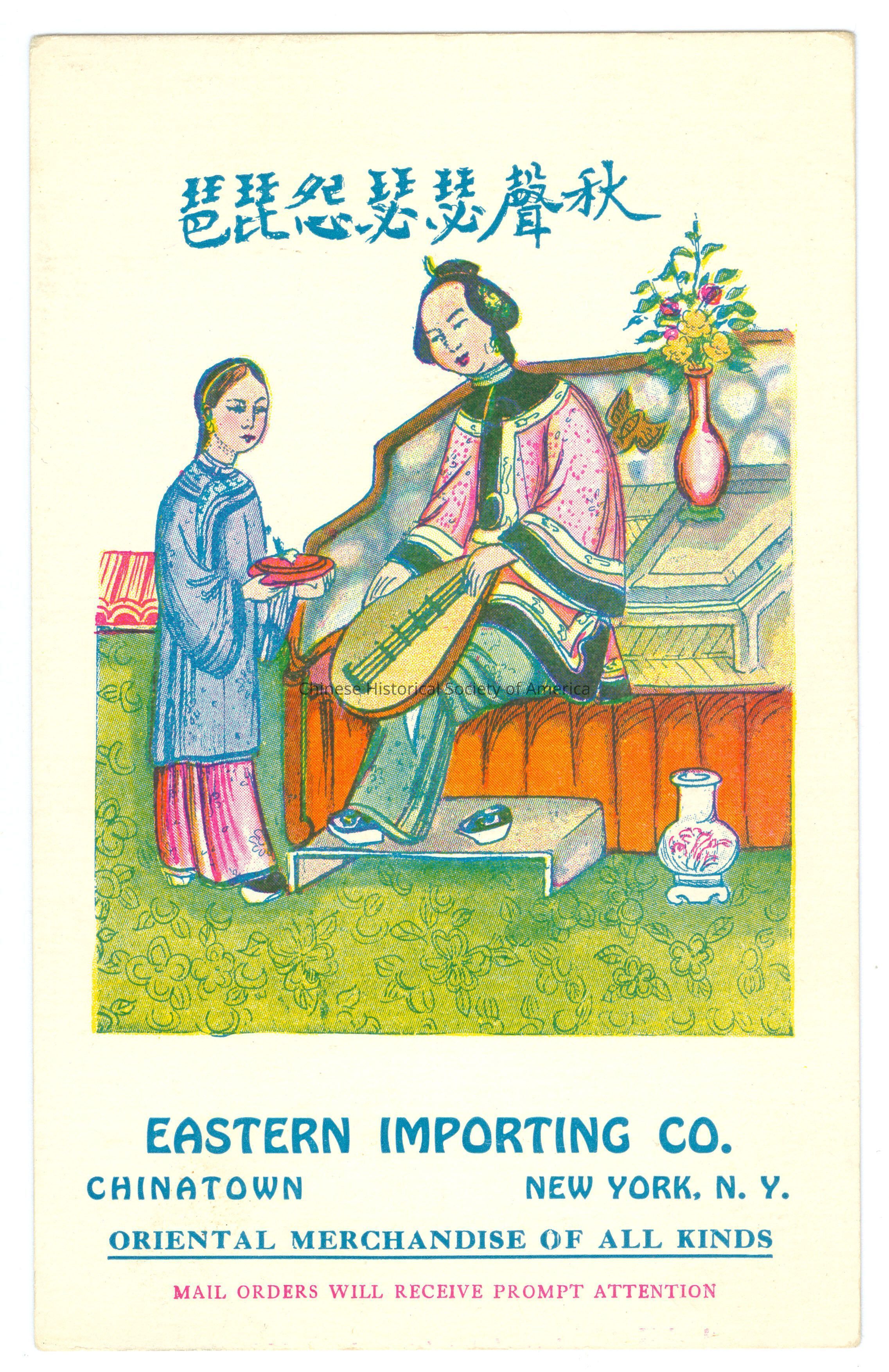 Color. Illus. New York; Ads; Eastern Importing Co.; Women: 2 Chinese women, one in a traditional high neck pink clothing is sitting on a couch holding a "gitar" on her lap, her maid is in blue and holding a red tray.