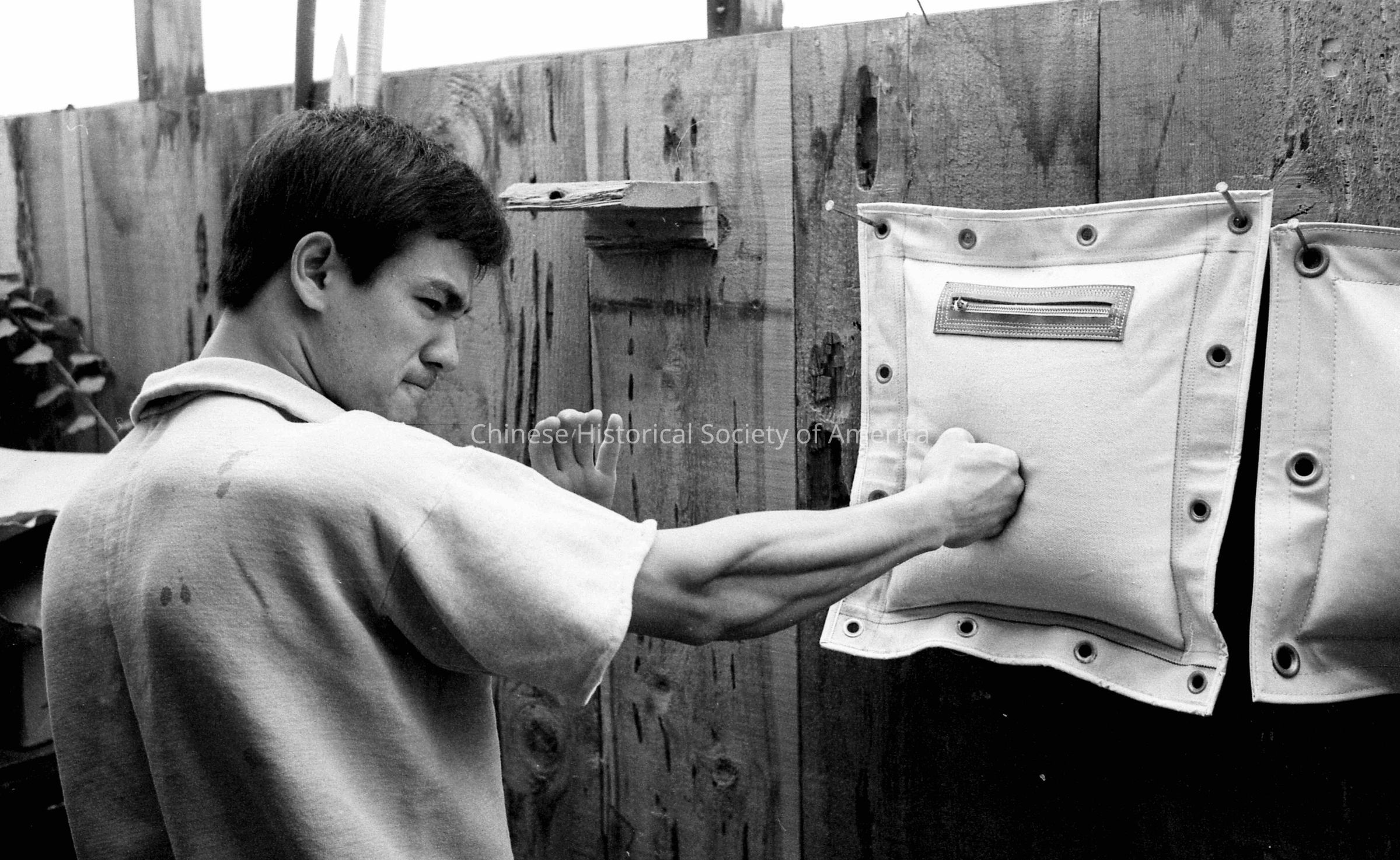 Retrieved from Bruce Lee Foundation: Bruce in sweatshirt, sweats, punching punching bag nailed to wooden fence, at home.