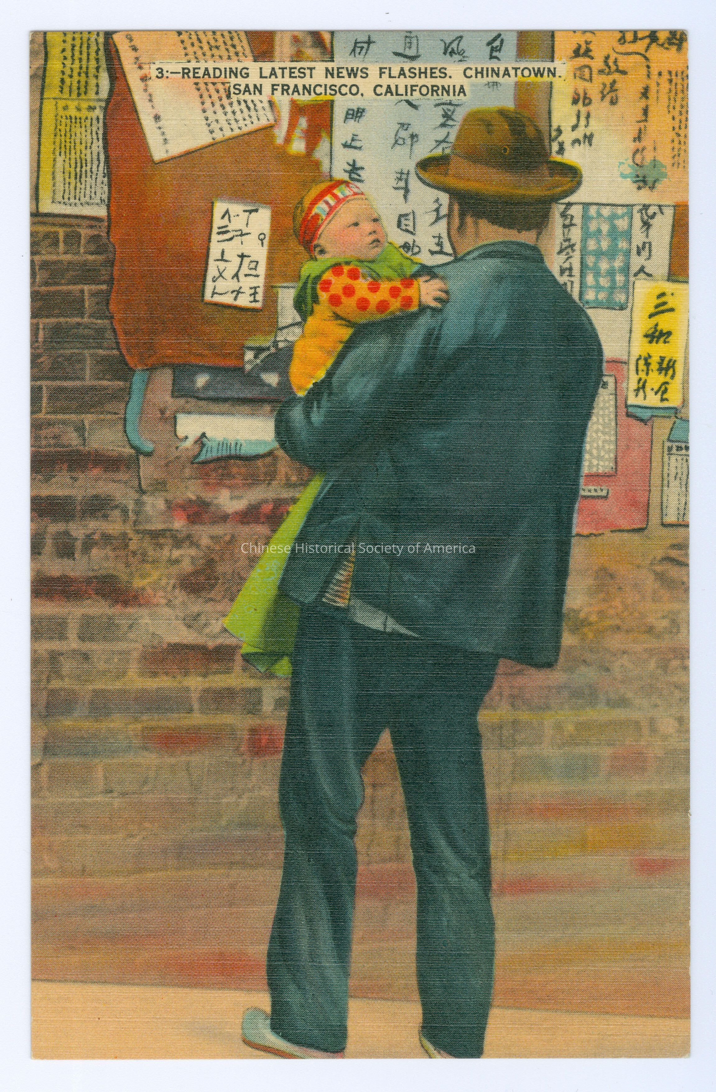 Front: Caption: "3:-Reading Latest News Flashes. Chinatown. San Francisco, Caifornia." Back: Info. Text: "The Chinese residents in San Francisco's Chinatown gather round to read the news, which is posted on the wall of buildings in the Chinese district."