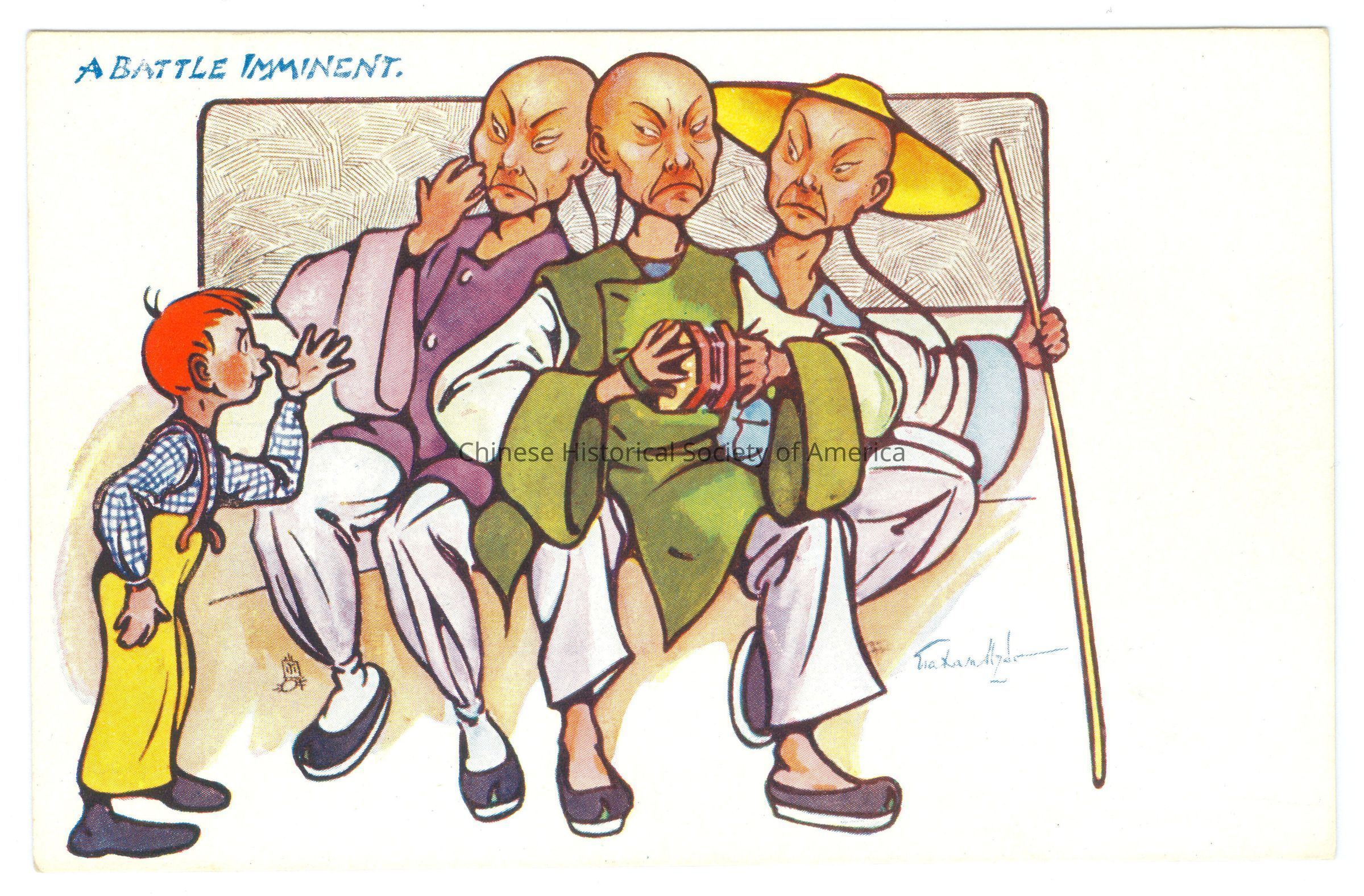 Color. Illus. Eraham Hyde Caricatures; Chinese Men: 3 Chinese men with queues and slanted eyes are sitting, one is holding an accordion and another holding a pole, they are being taunted by a little red haired White boy.