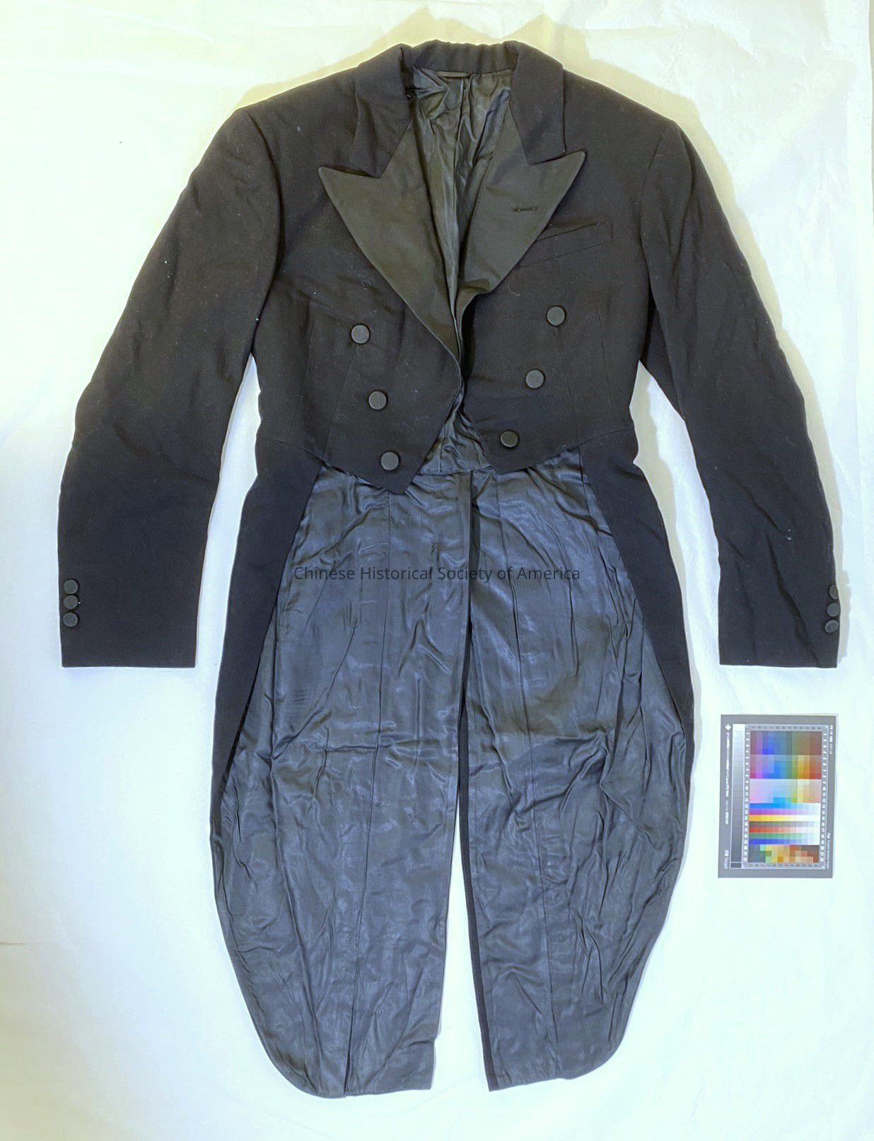 Black tuxedo tailcoat. Part of a tuxedo set. Attached paper tag which reads, "Y30 ²" on one side and "375 12/[?] L Toy" on the other side. Handwritten in ink is, "[48] - [480]" on the lining of the coat.