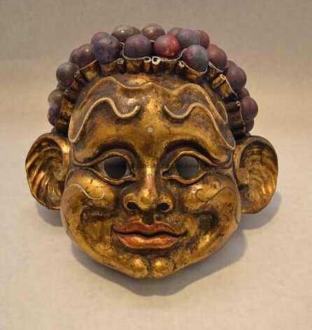 A mask in the ballet sequence from The King and I 1956 20th Century Fox; made by Wah Ming Chang. Injection molded mask having a cherubic face and Bacchus-like crown, painted gold with purple grapes.Dimensions