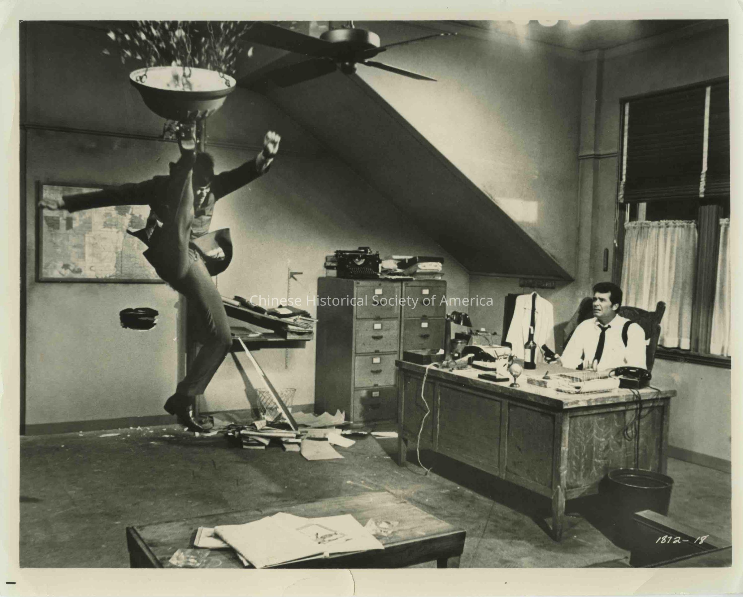 Retrieved from Bruce Lee Foundation: E.PM Bruce in action shot kicking lamp, jumping, in Marlowe, James Garner, office, smashed glass, desk, glossy.