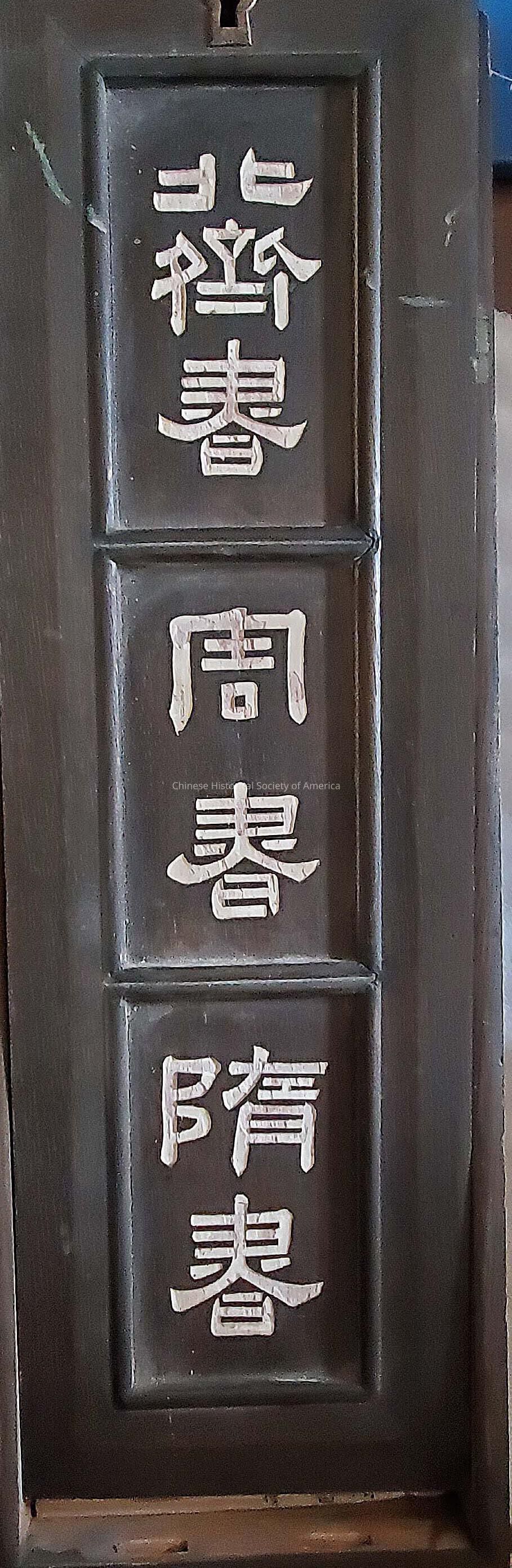 Wooden Liangshu box holds dynastic record books written in Chinese.