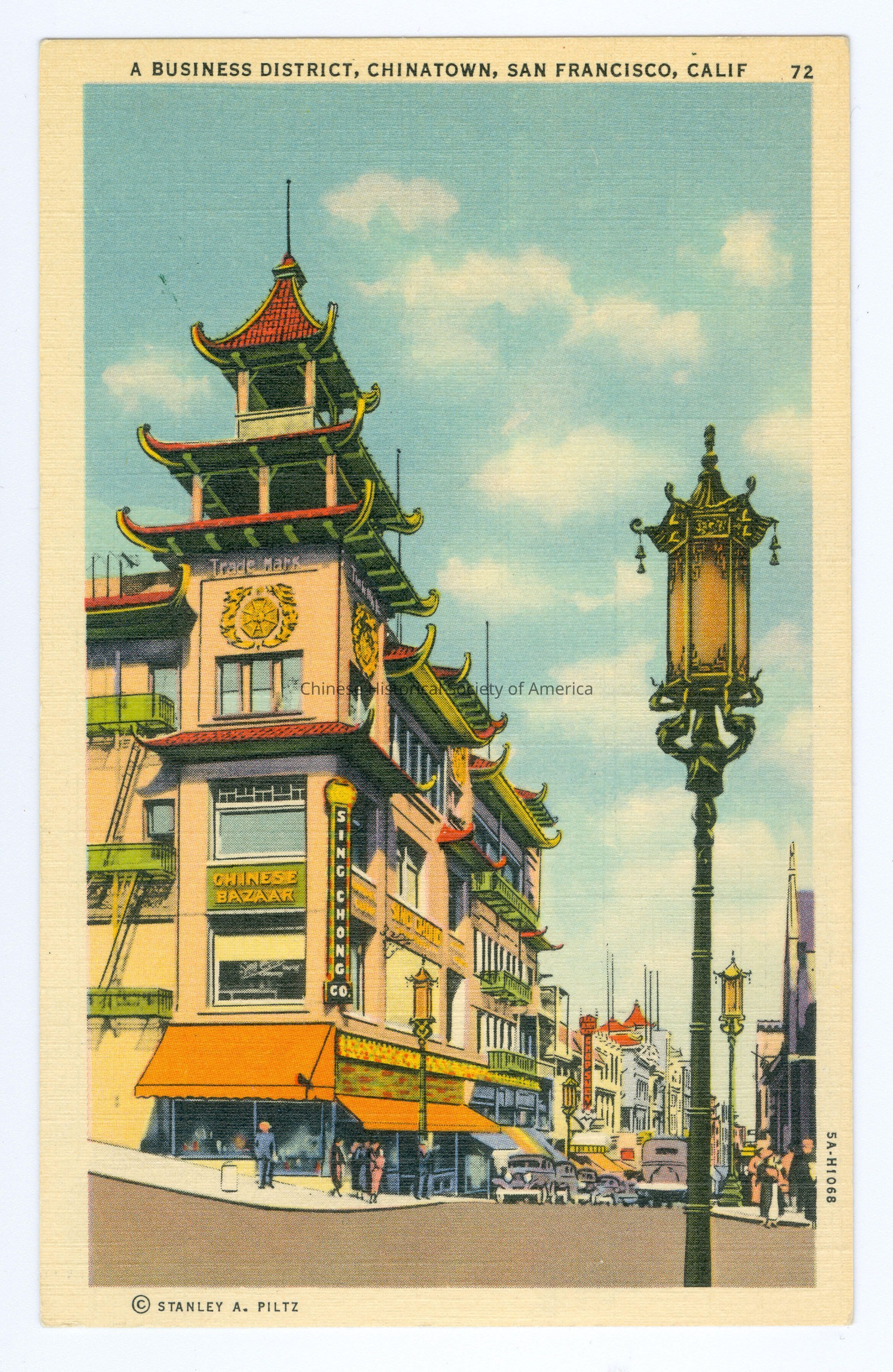 Front: Caption: "A Business District, Chinatown, San Francisco, Calif 72." "C. Stanley A. Piltz"; "5A-H1068." Back: Info. Text: "Chinese Bazaars and Shops. Chinatown, San Francisco. The picturesque style of pagoda architecture which prevails in San Francisco's Chinatown is all the more appreciated when the color effects are studied. Housed in these quaint and attractive structures one finds block after block of shops and large bazaars showing colorful, alluring, exquisite, imported Oriental merchandise different than you see elsewhere. Wise travelers save their money for San Francisco's Chinatown." Stanley A. Plitz Company, San Francisco, Calif. Old Accession #: GNE