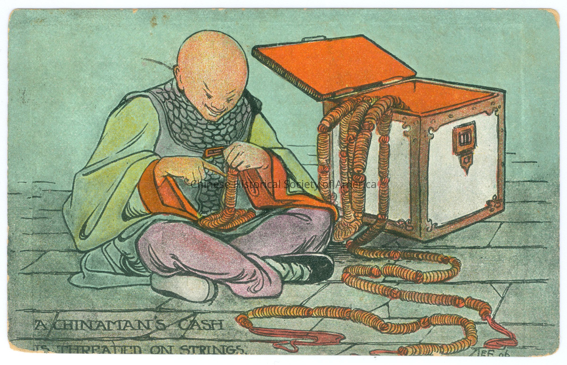 CHSA-04926 A-B. Color. Illus. Caricatures; Chinese Daily Life; Money: A-B: A Chinese man with a queue is sitting on the floor next to an open chest and taking coins threaded on string out of it.