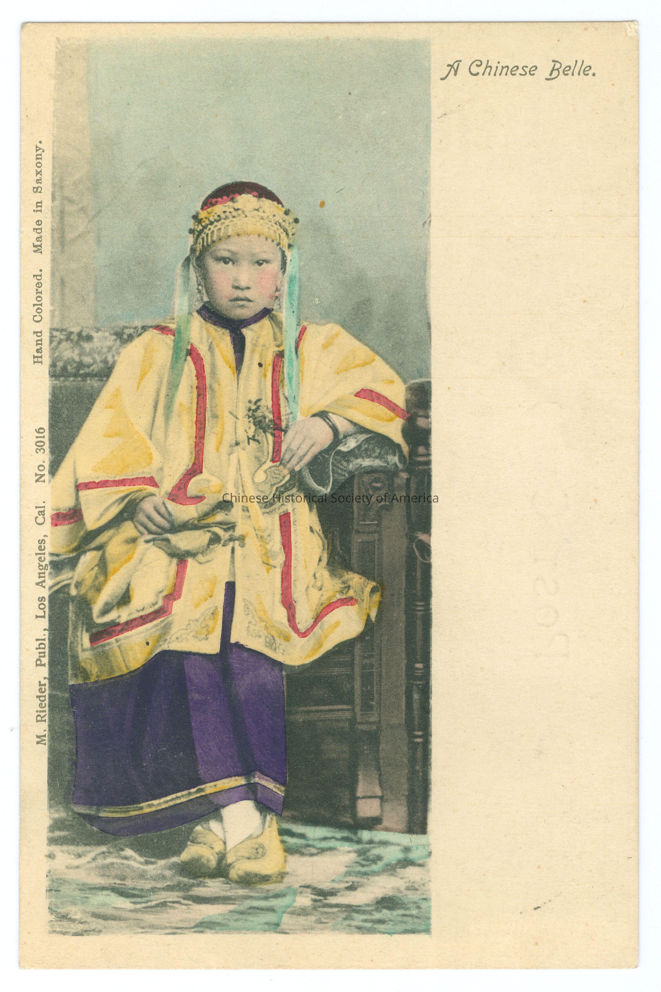 Front: Caption: "A Chinese Belle." "M. Reider, Publ., Los Angeles, Cal. No. 3016"; "Hand Colored. Made in Germany." Back: "1/28/79 AMX", handwritten in pencil. Old Accession #: AMX