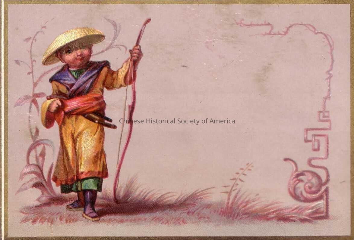 Front: Enclosed in a silver and gold border is a Chinese boy standing on the left. He is wearing a yellow, green, purple and red soldier outfit with a hat. Fastened by his belt is a sword and an arrow, with his right hand he is holding a bow.