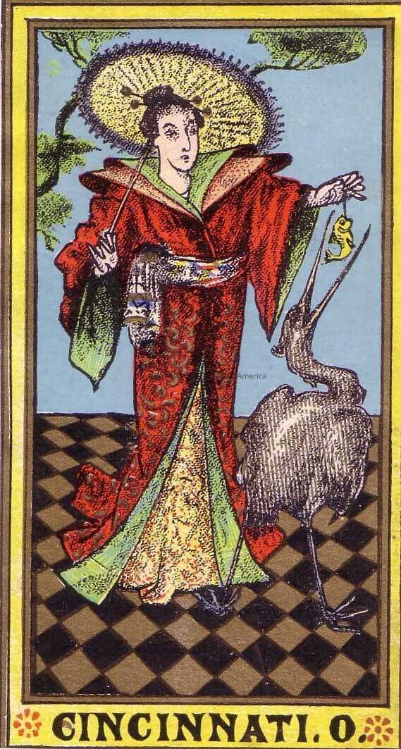 Front: A Chinese woman wearing a red, green, and orange robe, is standing onto top of a black and white checker floor with a blue backdrop sky and branches swinging behind her. On her left hand she is holding onto an umbrella, and with her right hand she is holding a fish on a string over the beak of a bird. On the bootom of the tradecard is the word "Cincinnati.O."
