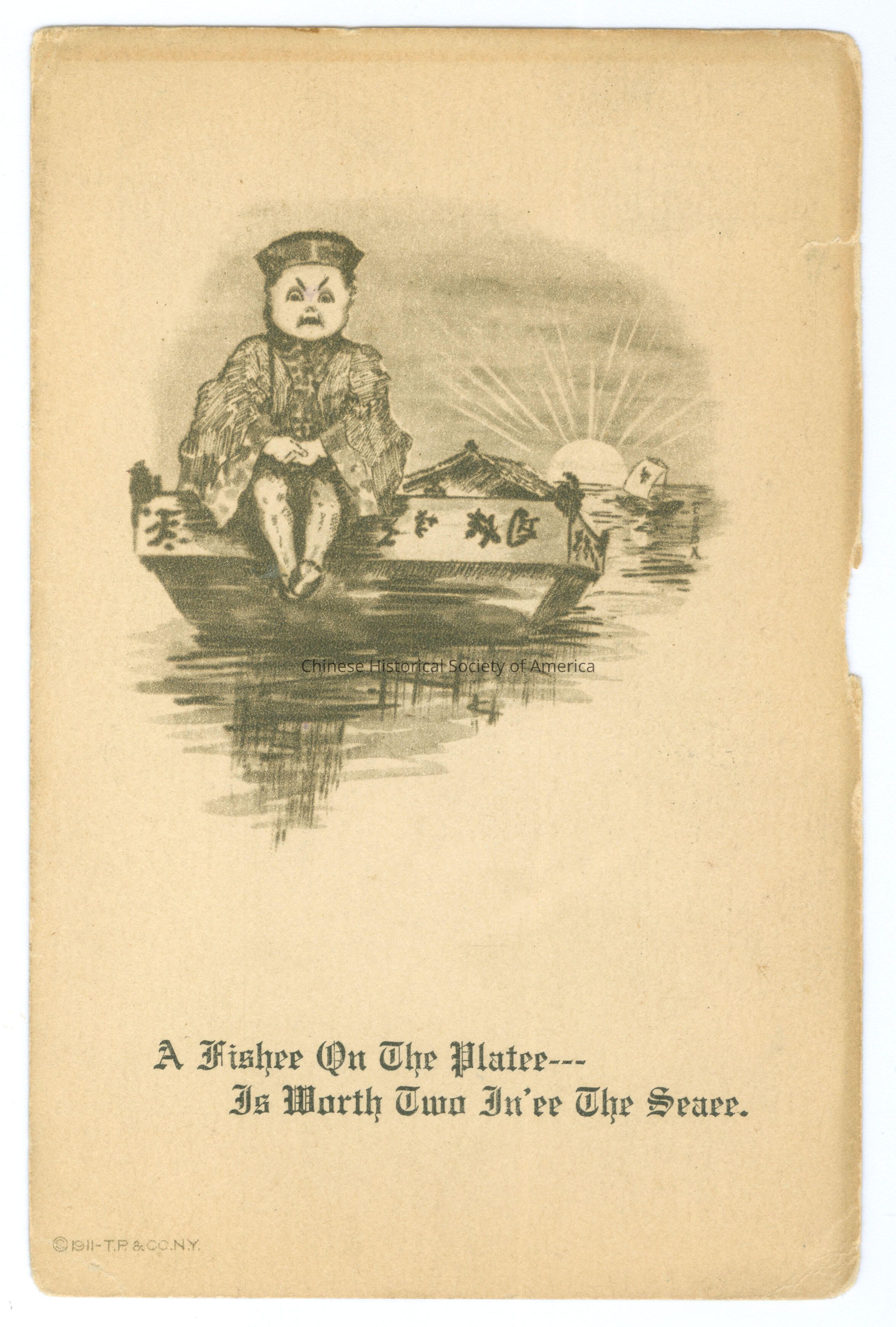 B&W. Illus. Caricatures; Valentine Cards; Men: A Chinese man with slanted eyes and a queue is sitting in a boat in the water, he has an angry expression and there are "Chinese" characters on the boat and the sun is setting in the background.