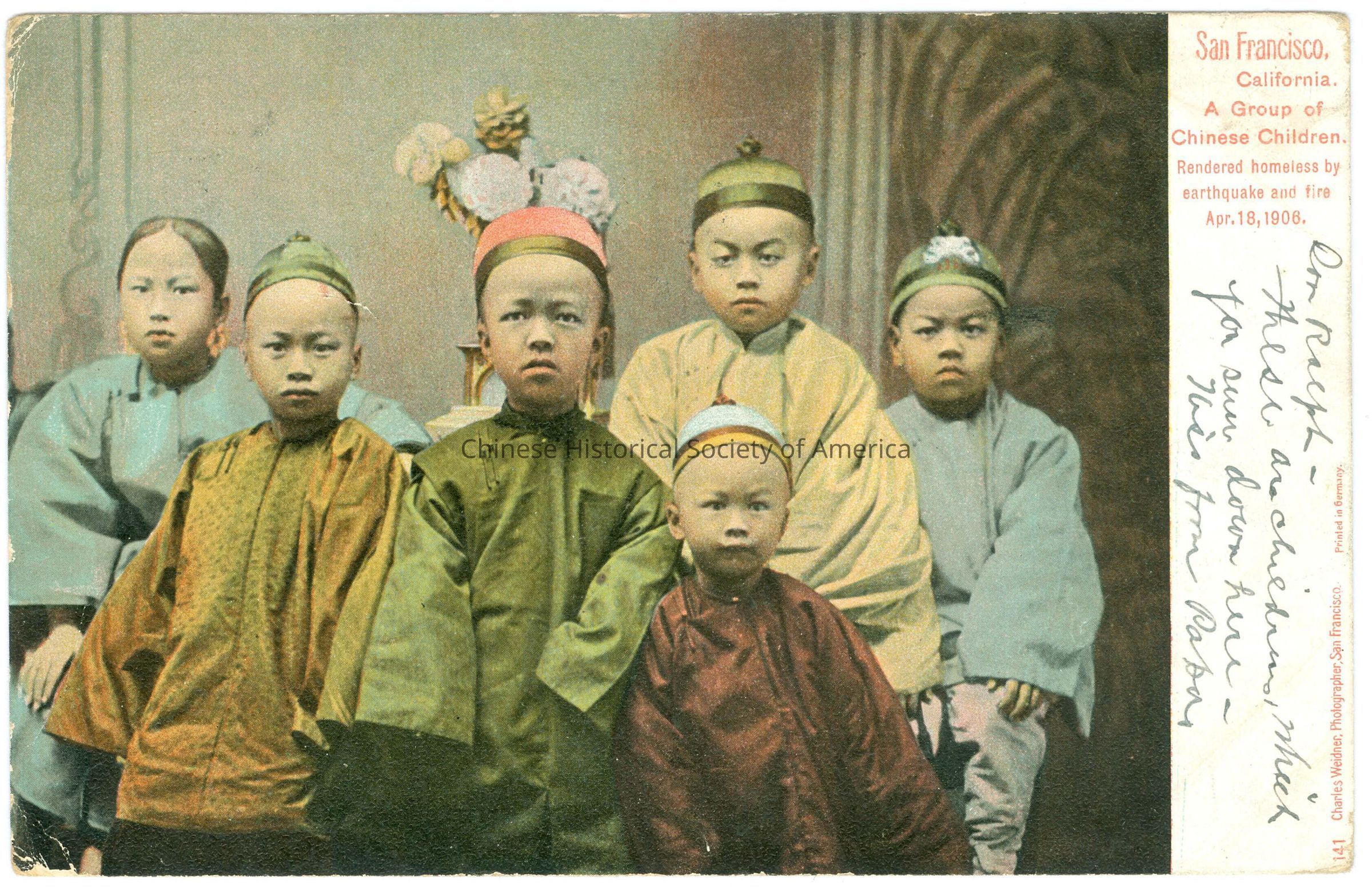 Color. Photo. SF; Children: There are 5 Chinese boys and 1 Chinese girl sitting inside with a flower arrangement behind them, the girl is wearing blue and the other boys are wearing hats.Front: Caption: San Francisco, California. A Group of Chinese Children. Rendered homeless by earthquake and fire Apr. 18, 1908." Message: "Dear Ralph - These are children, which you see down there - This from papa", handwritten in black. Back: PostmDimensions