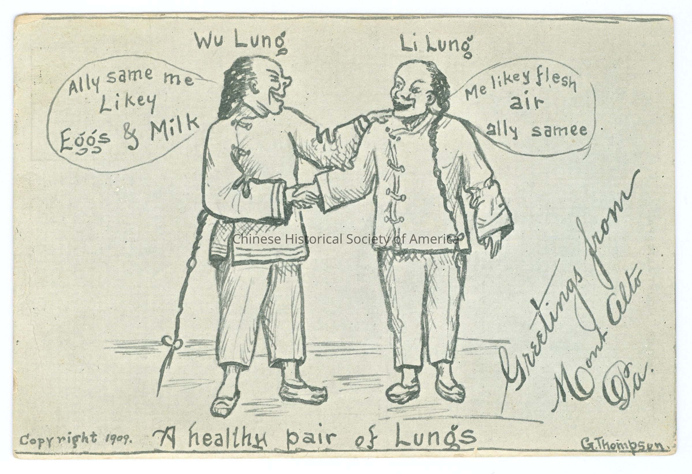 Front: Caption: "A healing pair of lungs; Wu Lung, Li Lung; Ally same me Likey Eggs & Milk; Me likey flesh air ally same." Message: "Greetings from Mont. Alto PA", handwritten in black. "Copyright 1909."; "G. Thompson." Back: Postmark: "Mont Alto Oct 20 1912 3PM" Stamp: A green half penny stamp with a side picture of Benjamin Franklin. "U.S. Postage One Cent". "Frank Heitler. Mount Alto. PA."