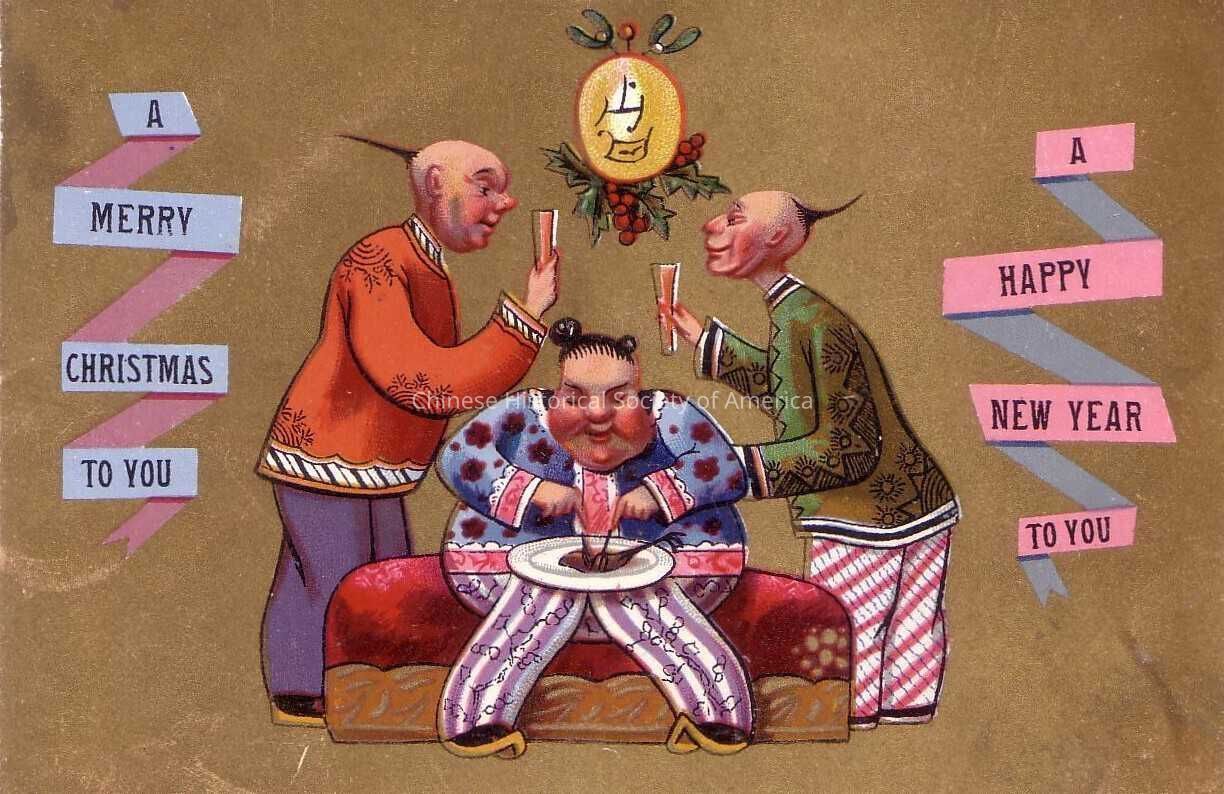 Front: Standing around a couch are three man socializing and talking during a holiday celebration. Seated on a plush couch is an overweight man wearing a blue and flower embroidered shirt and purple and white stripe pants. He is sitting down and in the process of cutting up pieces of fish with a fork and a knife. On either side of him are two more men toasting one another with a glass of wine. On the left, highlighted in blue is the following greeting: A Merry Christmas to You and on the right highlighted in pink is "Wishing You a Happy New Year."