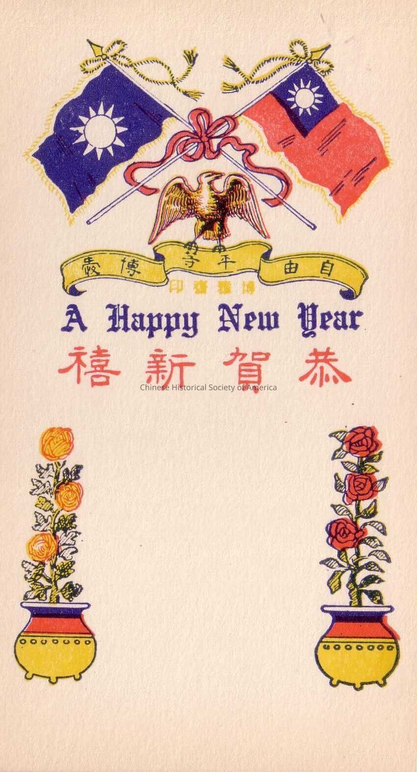 Front: Two flags, both symbolizing the flag of Taiwan is illustrated at the top of the tradecard criss-crossed and tied with a red ribbon. Below the flag is a eagle resting on top of a yellow banner with Chinese characters written across it. The words "A Happy New Year" is written under it in blue, followed by more Chinese characters in red. Flower pots with flowers in it line both the lower left and right side of the tradecard.