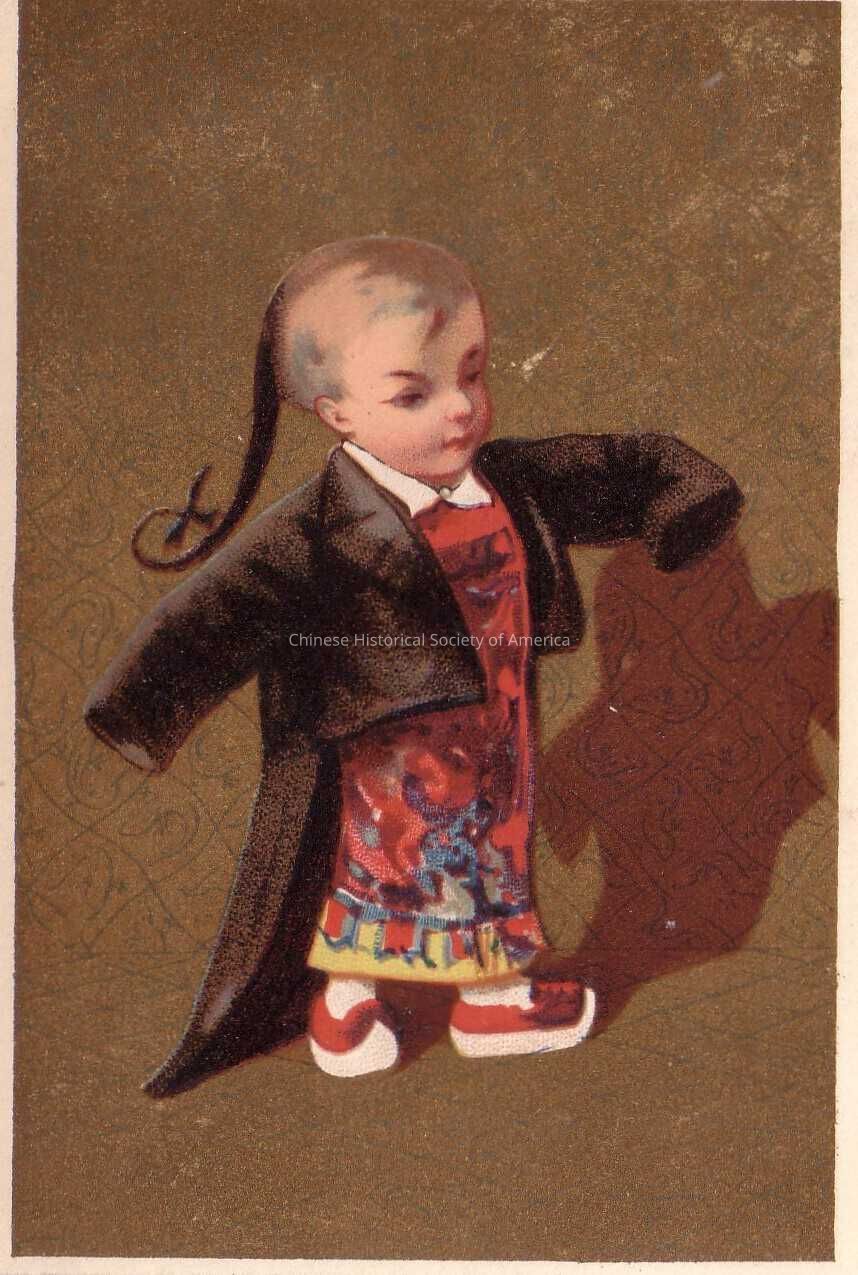Front: A litte boy is dressed in a traditional Chinese gown in the colors of red, black, green and yellow, but over it, he has on an oversized black tuxedo jacket.With his queue hanging out from behind him the boy's outstreched arms do not even reach the ends of the sleeves. The boy is standing on an olive green square tile wall and floor.