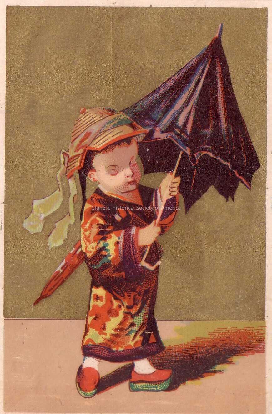 Front: A Chinese boy dressed in a traditional robe with a mosaic design in red, green, and yellow is standing with his eyes closed. He has on his feet red slippers with green soles, and on his head is a straw hat with a ribbon tied around it. Clutch in both of his hands is a black umbrella that is only partly opened. He is standing in front of an olive green wall.
