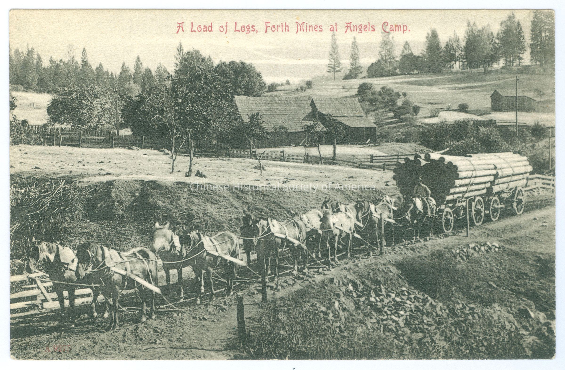 Front: Caption: "A Load of Logs, Forth Mines at Angels Camp." "A 9275." Back: "Publ. by the City Drug Store, Angels CAmp, Cal. Germany"; "SL & Co." Old Accession #: N)-