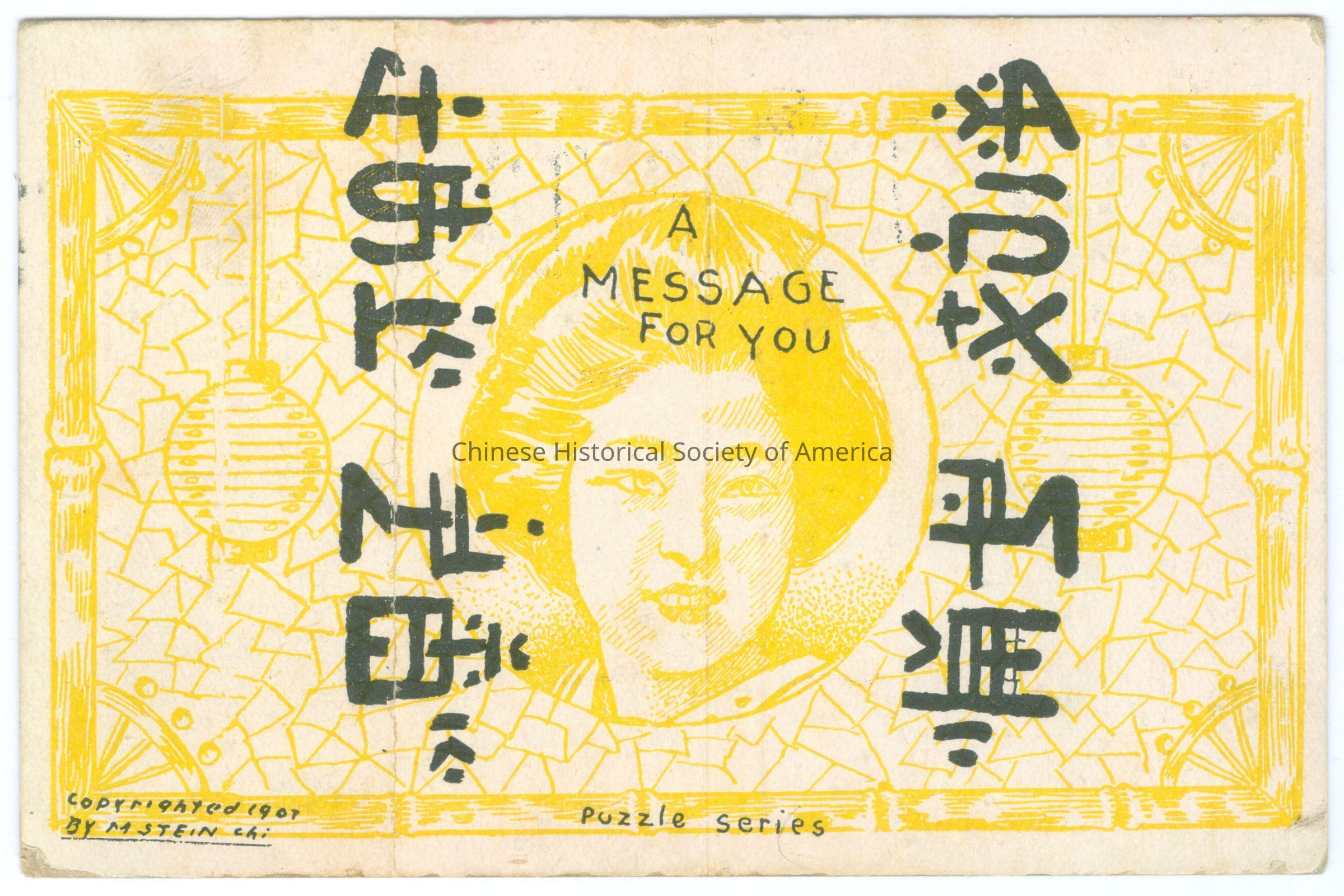 Front: Caption: "A Message For You"; "Ask Me."; "Puzzle Series."; "Copyrighted 1907 By M. Stein Chi." Back: Postmark: Illegible. Stamp: A green one cent stamp with a picture of Benjamin Franklin, "Series 1902, United States of America, 1706 Franklin 1790, Postage One Cent." Message: "Hello Sis can you make out this puzzle. How is the farm anyway fine __, it has rained here every day for two weeks and still raining. Will __ home in August. Homer."; "Miss Myrtle Sandres. Plattsmouth, Neb." handwritten in black. Old Accession #: E)