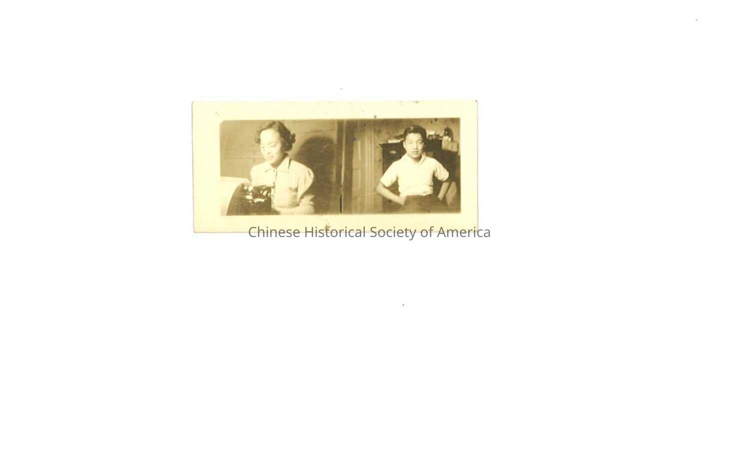 Black and white photo of 2 people in 2 rooms. Left side a mother types on a typewriter, on the right a boy sitting with his hands in pockets.