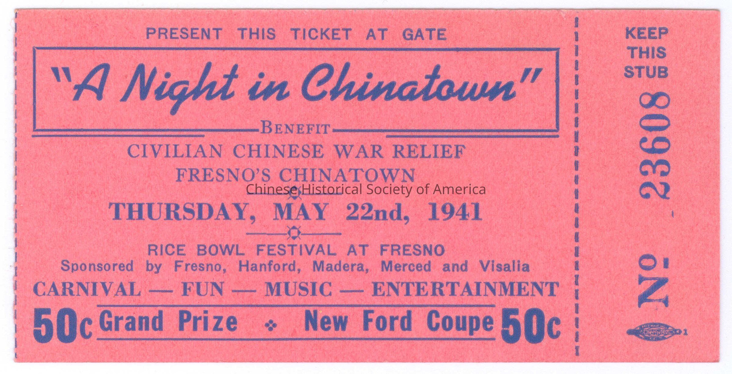 Ticket for "A Night in Chinatown" Benefit for the Civilian Chinese War Relief in Fresno's Chinatown.