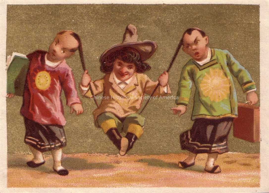 Front: An Caucasian boy wearing greenpants and a tan jacket and hat swings on the queue of his two Chinese classmates. To his left is a Chinese boy holding a green binder with paper in it, wearing a red long shirt and a black skirt while to his right is another Chinese boy holding a brief-case, wearing a green shirt and a black skirt.
