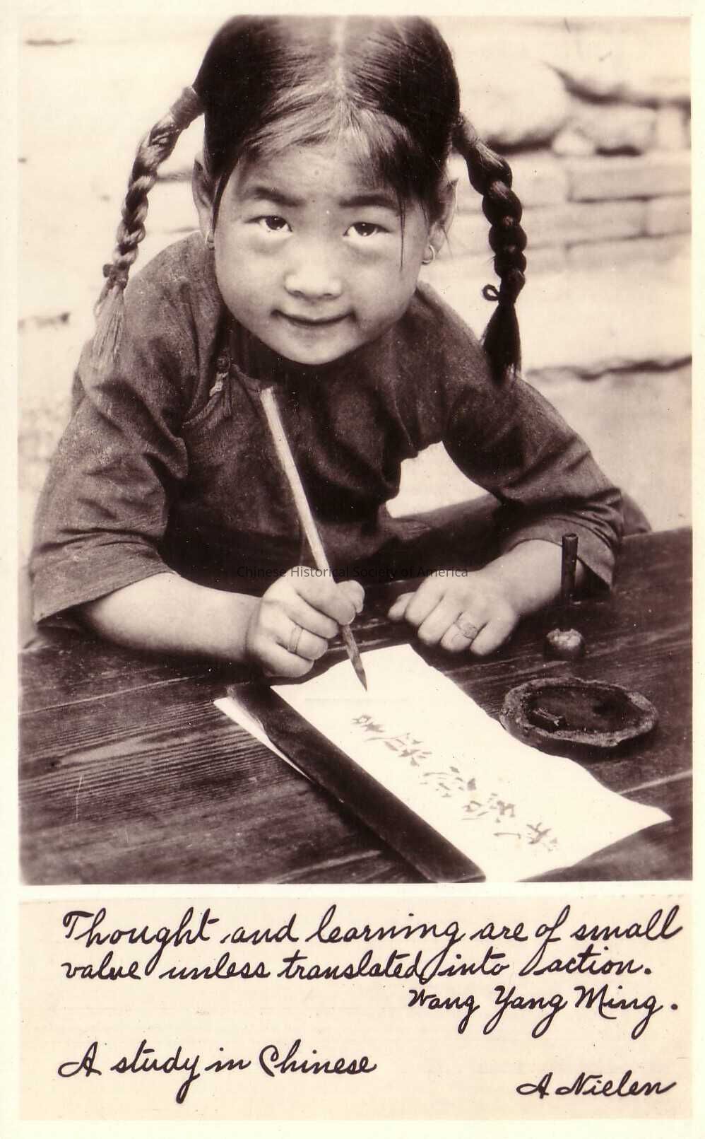 Front: A young Chinese girl who has her hair in two braided pig tails and who is wearing a grey dress, is working on her Chinese caligraphy lesson. She is sitting behind a wooden table and her caligraphy brush in in the air as she practices her lessons. Her container of ink and her ink pad sits next to her. Written in cursive as a footnote underneath the photograph is the following: