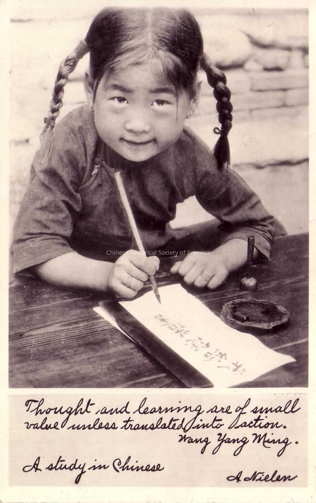 Front: A young Chinese girl who has her hair in two braided pig tails and who is wearing a grey dress, is working on her Chinese caligraphy lesson. She is sitting behind a wooden table and her caligraphy brush in in the air as she practices her lessons. Her container of ink and her ink pad sits next to her. Written in cursive as a footnote underneath the photograph is the following: